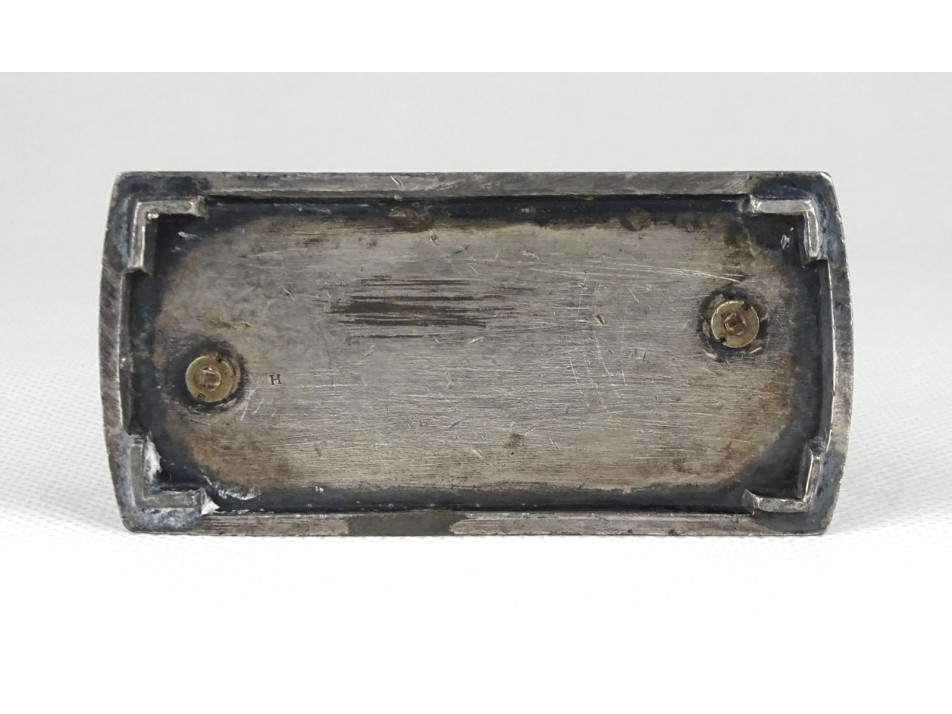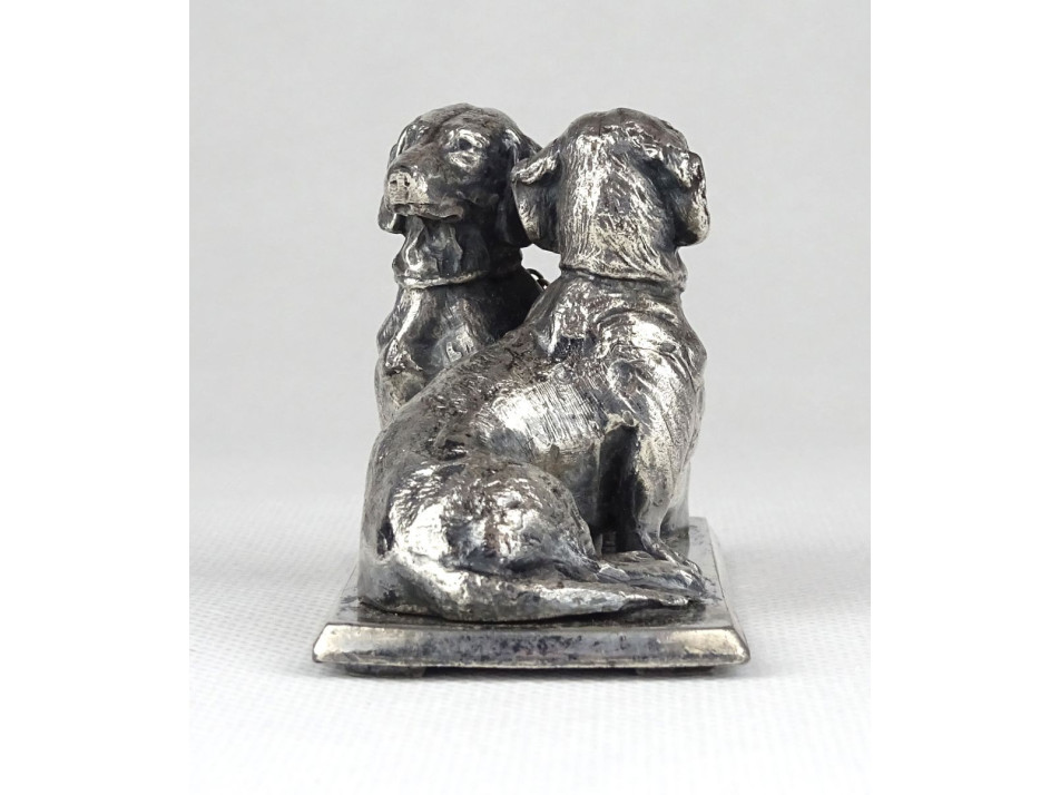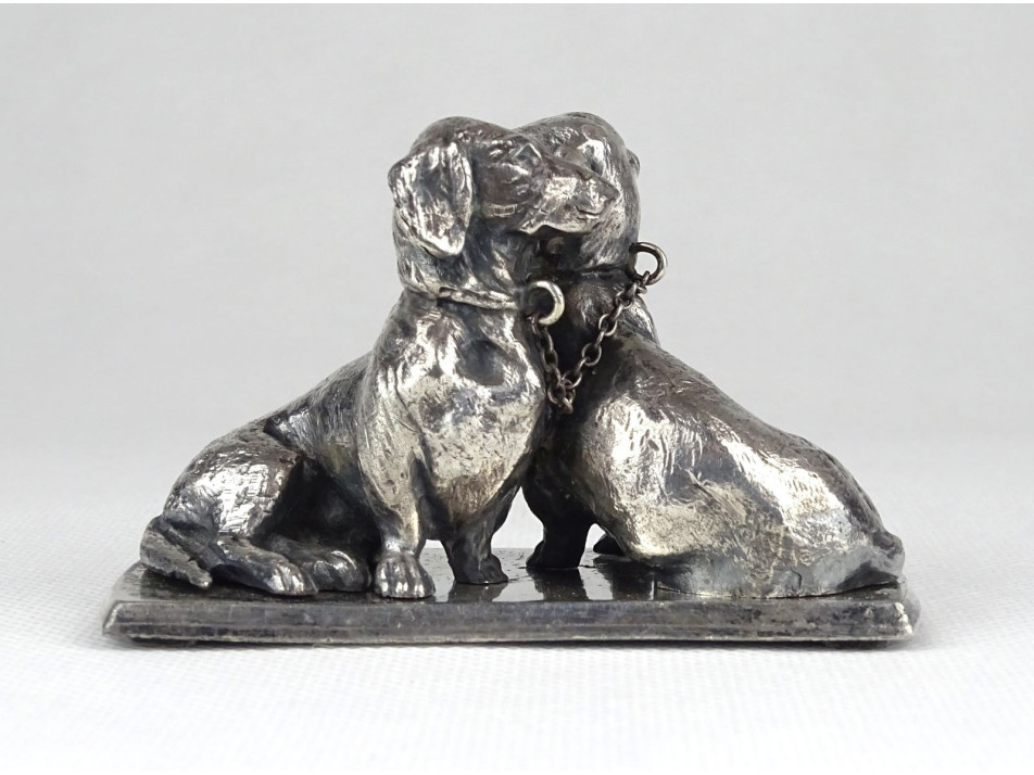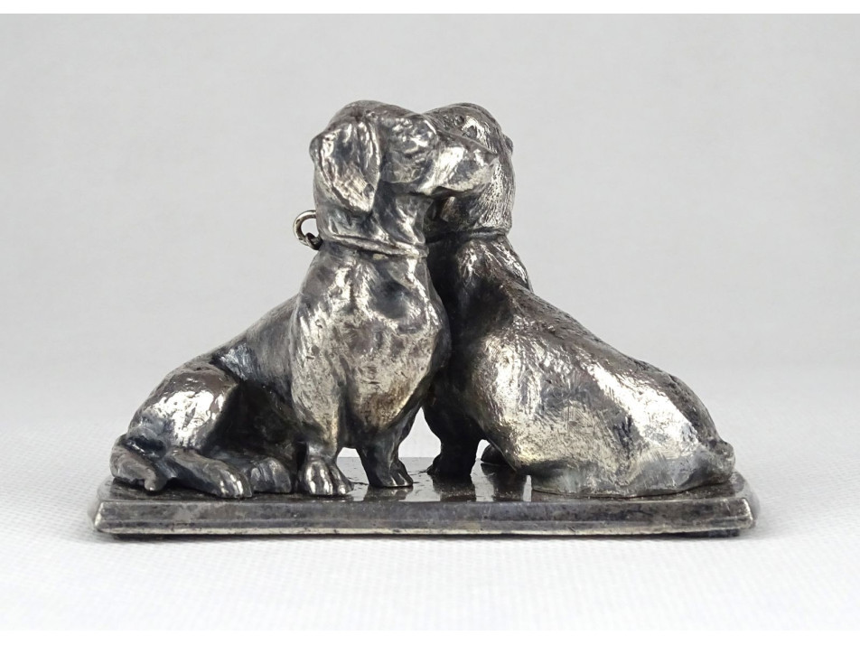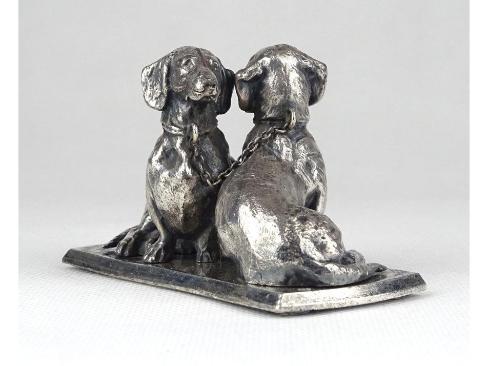 Régi, kis méretű, hibátlan állapotú ezüst talapzaton ülő ezüst tacskó pár egymásnak háttal. Szépen megmunkált ötvösmunka. Nyakörvük lánccal összekötve.