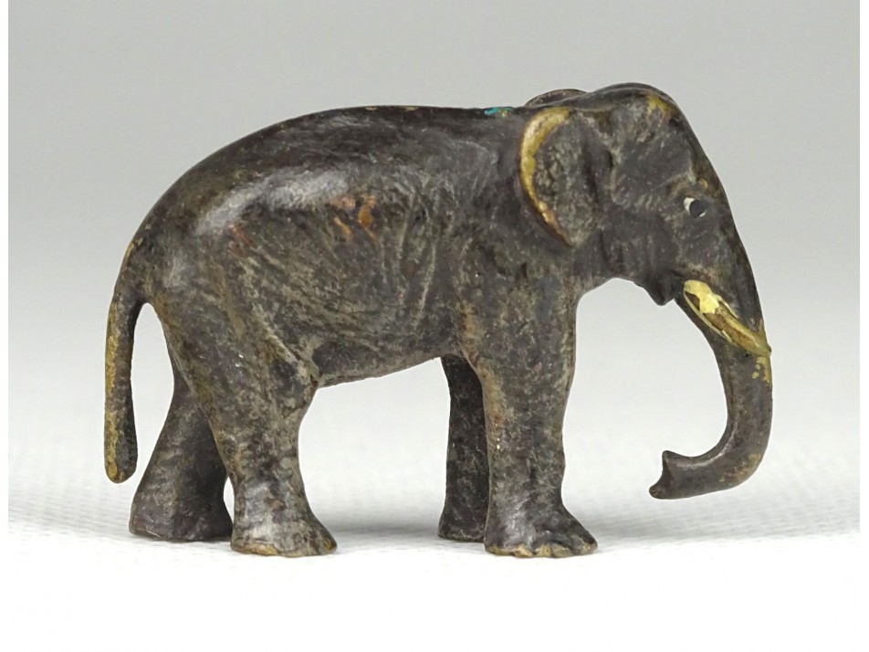 Antik, kis méretű bronz elefánt szobor. Bár patinás darab, de testén a szürke festés jól látható. Szemei szintén kézi festettek, agyarán is a kézifestés nyomai láthatóak.