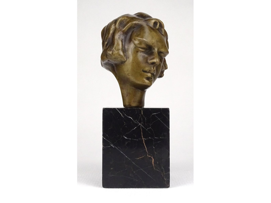 Szép állapotú márvány talapzaton álló jelzett bronz szobor. Női arc, női fej.