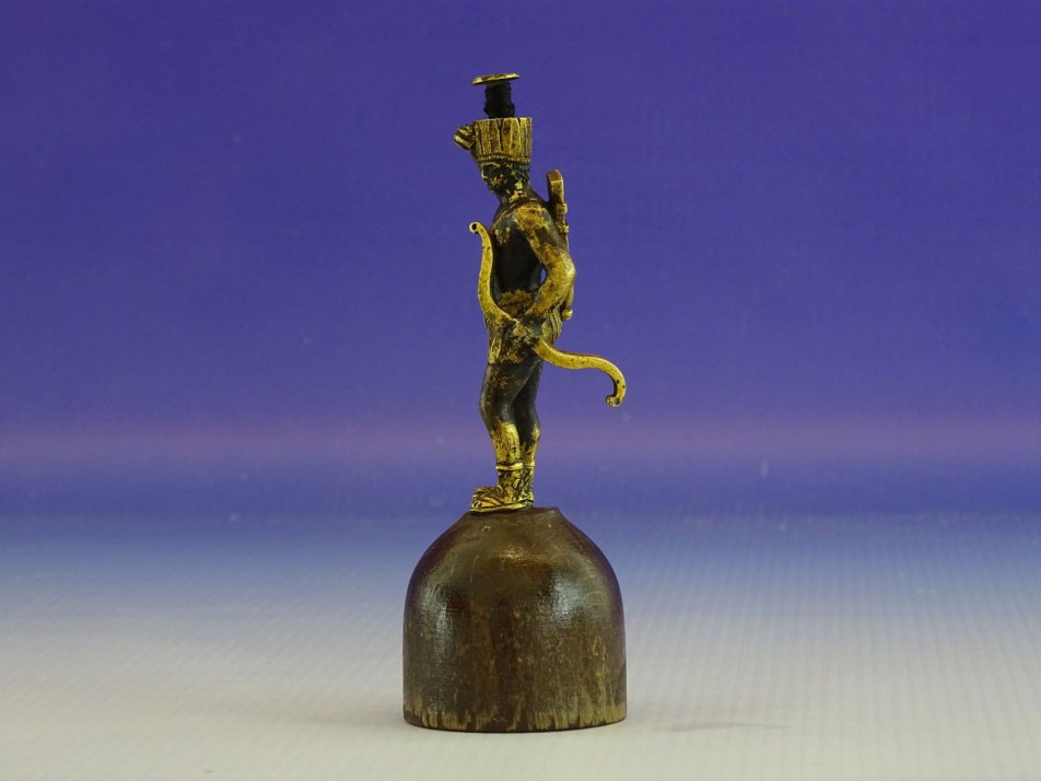 Régi, kisméretű, szépen megmunkált, egyiptomi íjász katona bronz szobra fa talapzaton.