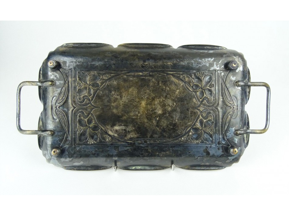 Jelzett WMF vörösréz századeleji tálca, rajta plasztikus szecessziós díszítés. Alsó felén korábbi ezüstözés nyoma jól látható. Alján madaras jelzés: WMF