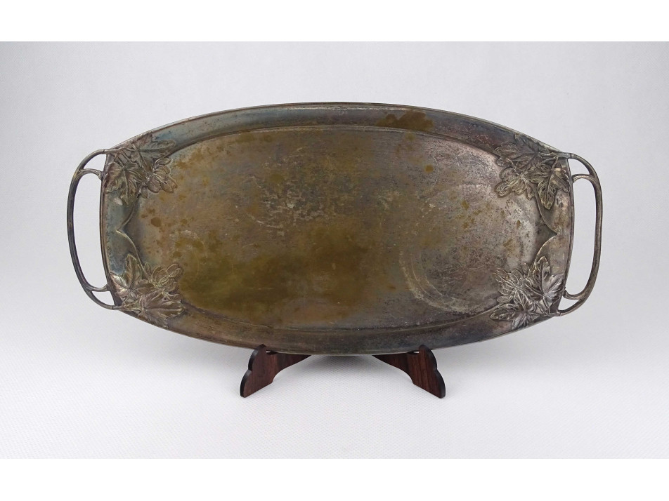 Antik, jelzett, századeleji ezüstözött WMF réz tálca, plasztikus szecessziós díszítéssel. Rajta kopottas ezüstözés.