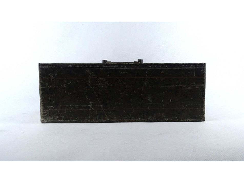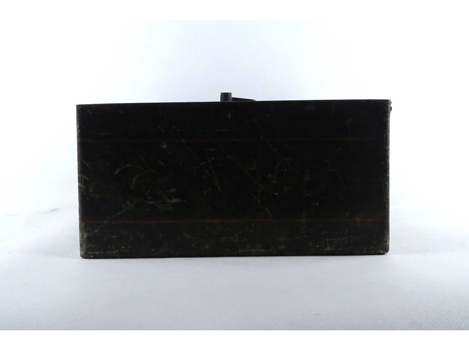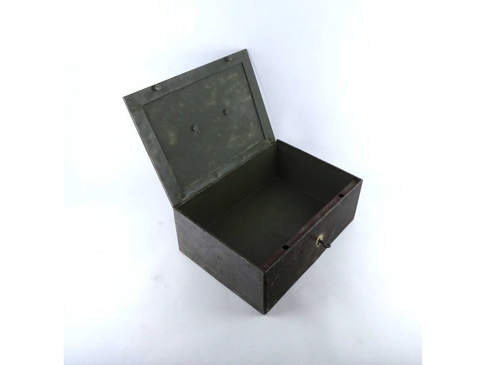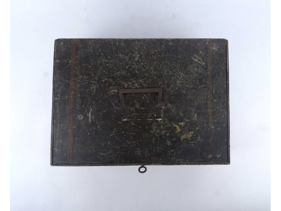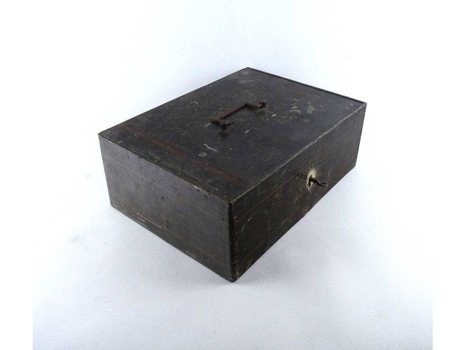 Antik, festéssel díszített, füllel rendelkező, zárható pénzkazetta, kisméretű páncél kazetta egy darab kulccsal. Festése kopottas.