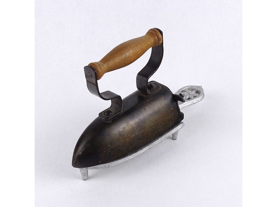 Antik, szép állapotú, kisméretű, vasmagos vasaló. Tartozik hozzá egy ezüst színűre festett, áttört, növényi inda mintás öntöttvas vasaló állvány.