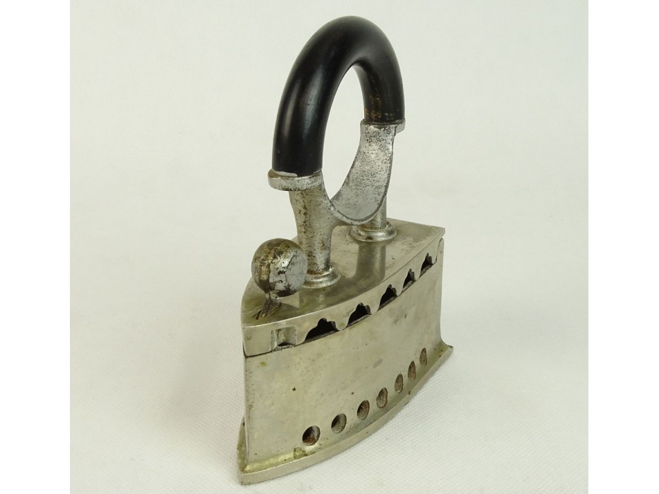 Öntöttvasból készült, szép állapotú, fényesített felületű, kisméretű szenes vasaló hajlított fa markolattal. Belső betétje, rácsa is megvan.