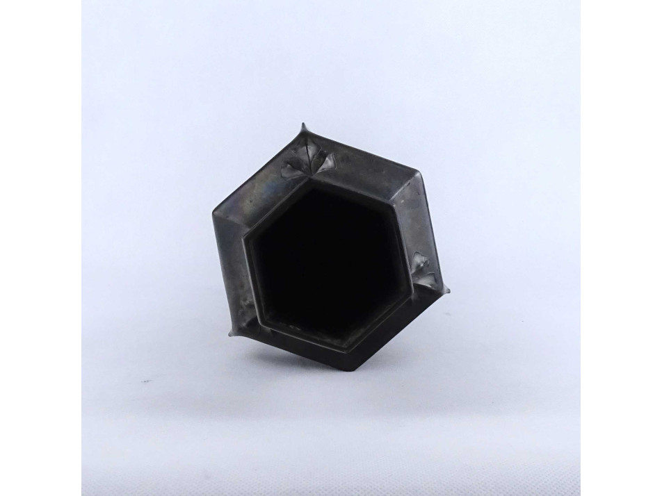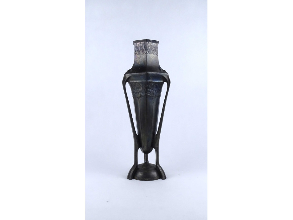 Antik, nagyméretű, hibátlan állapotú, különleges szecessziós forma, három lábon álló ezüstözött ón váza, urnaváza.