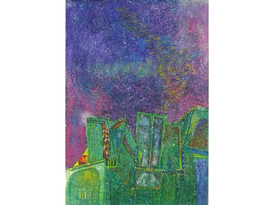 Papír akvarell, tus, tempera vegyes technika üveglap mögött.