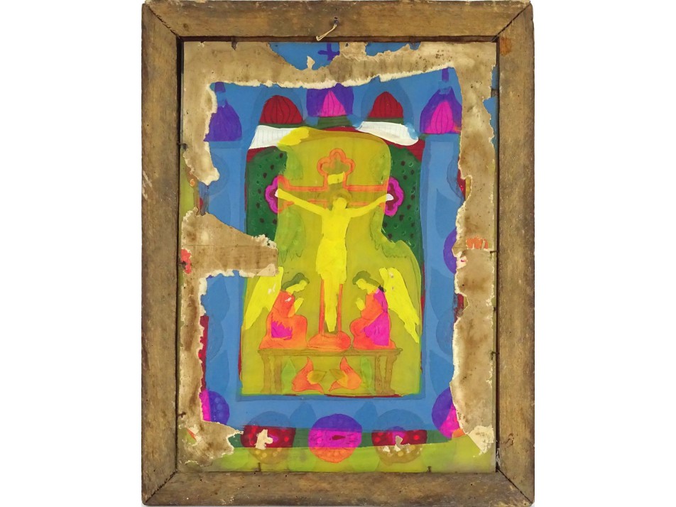 Antik erdélyi üveg ikon Krisztus a kereszten két anyallal ábrázolva 46 x 37 cm