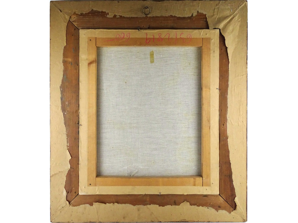 Antik, jelzetlen olaj vászon festmény, szép állapotú arany színű keretben, felújítás-mentes állapotban. A festményen több apró sérülés látható, a festék lepattogzott a vászonról.