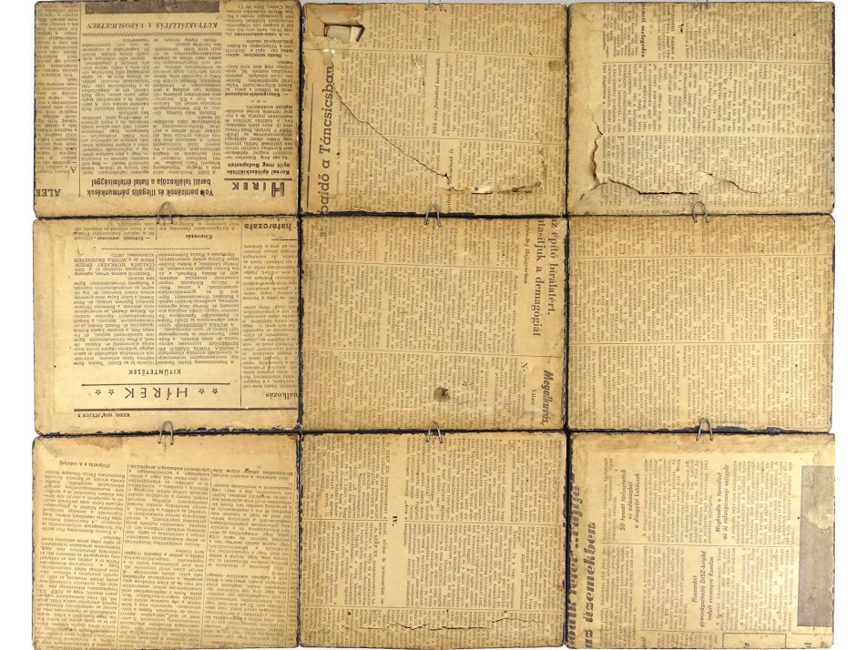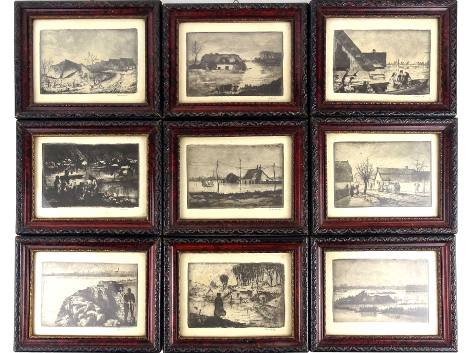 9 darab kisméretű, jelzett grafika, négy különböző jelzéssel. A kilenc árvíz tematikájú rézkarc egyforma méretű, egységes keretben van, üveglap mögött.