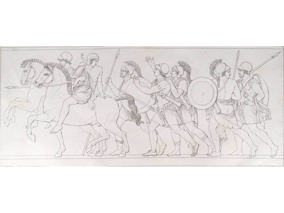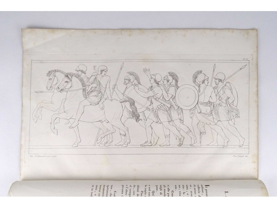 Antik, mártott papíron található, görög lovas és gyalogos katonákat ábrázoló nyomatok. Mellettük olasz és francia nyelvűszöveg.