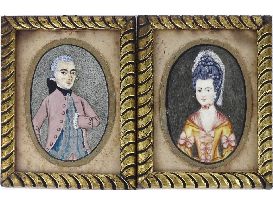 Antik, miniatűr barokk, főúri porté festmény pár, képpár, üveglap mögött aranyozott keretben.