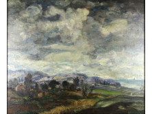 Papír akvarell festmény üveglap mögött, paszpartuban, régi fekete keretben. A papíron kisebb szakadás nyoma található, lásd fotó.