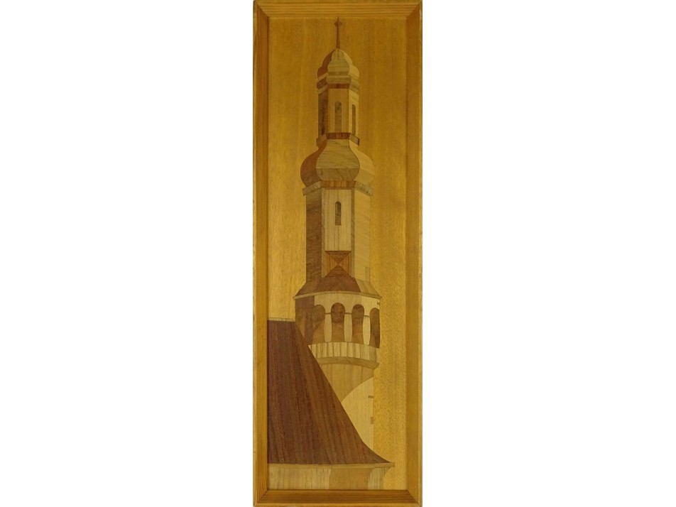 Régi, szép állapotú, keretezett sok fával elkészített műves intarzia munka. Falra akasztási lehetőséggel rendelkezik.