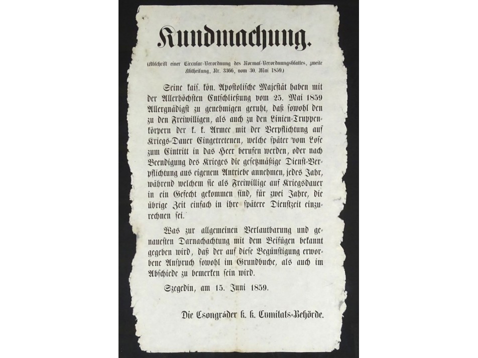 Monarchia korabeli német nyelvű katonai hirdetmény 1859