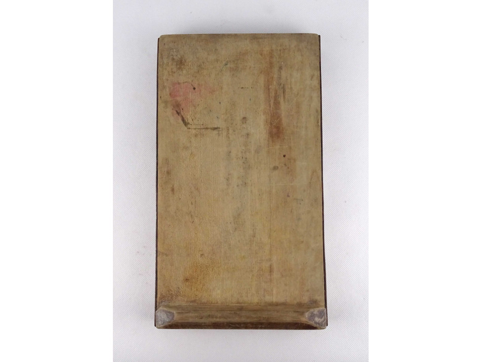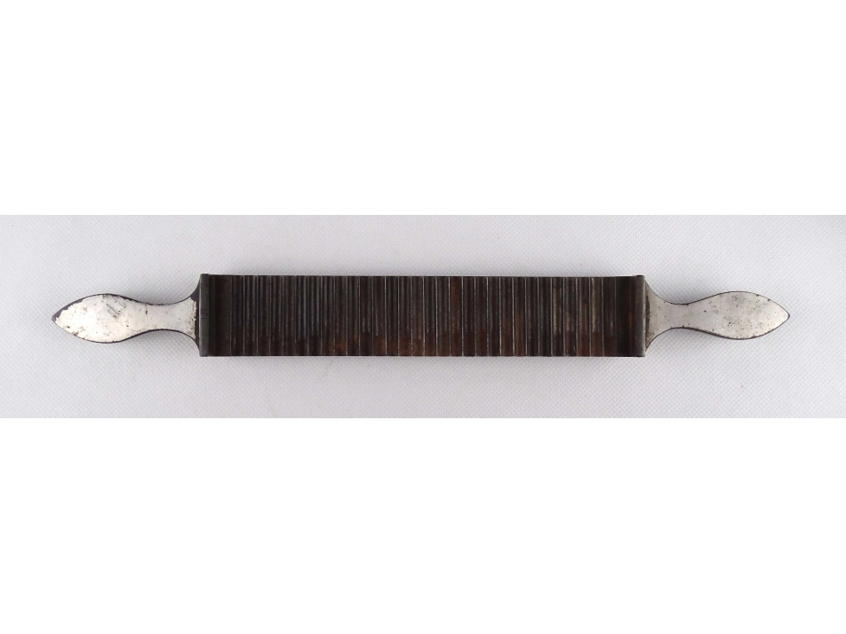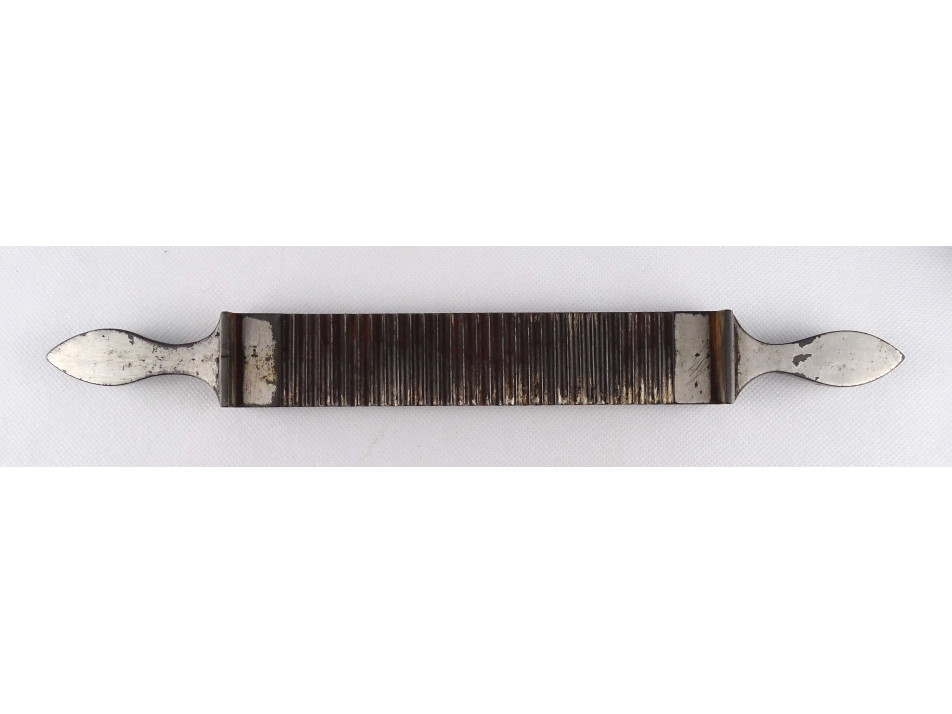 Antik, szép állapotban megmaradt, fa és fém szerkezetű gyógyszerész pirulakészítő, patikai eszköz. A pirulakészítő léc és a kétoldalas fém betét eredetileg krómozott vagy nikkelezett bevonata kopottas.