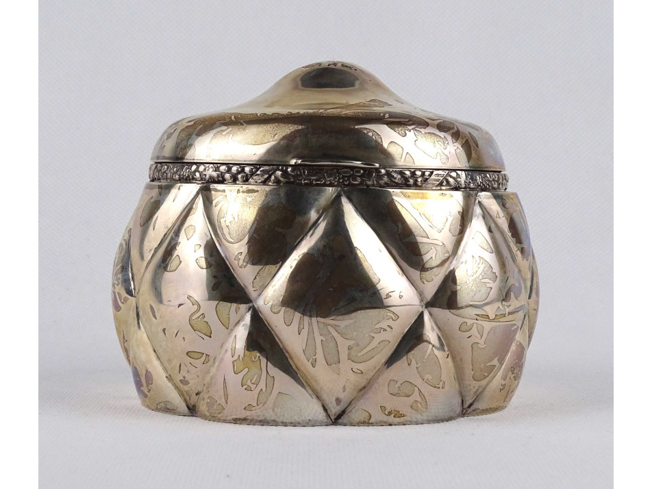 Antik, 800-as finomságú, nagyméretű, hólyagos mintájú cukordoboz, bonbonier. Rajta 1937-ig használt, jobbra néző 3-as Diána fejes, 800-as finomság jelzés, mellette " TGY " mesterjegy látható.