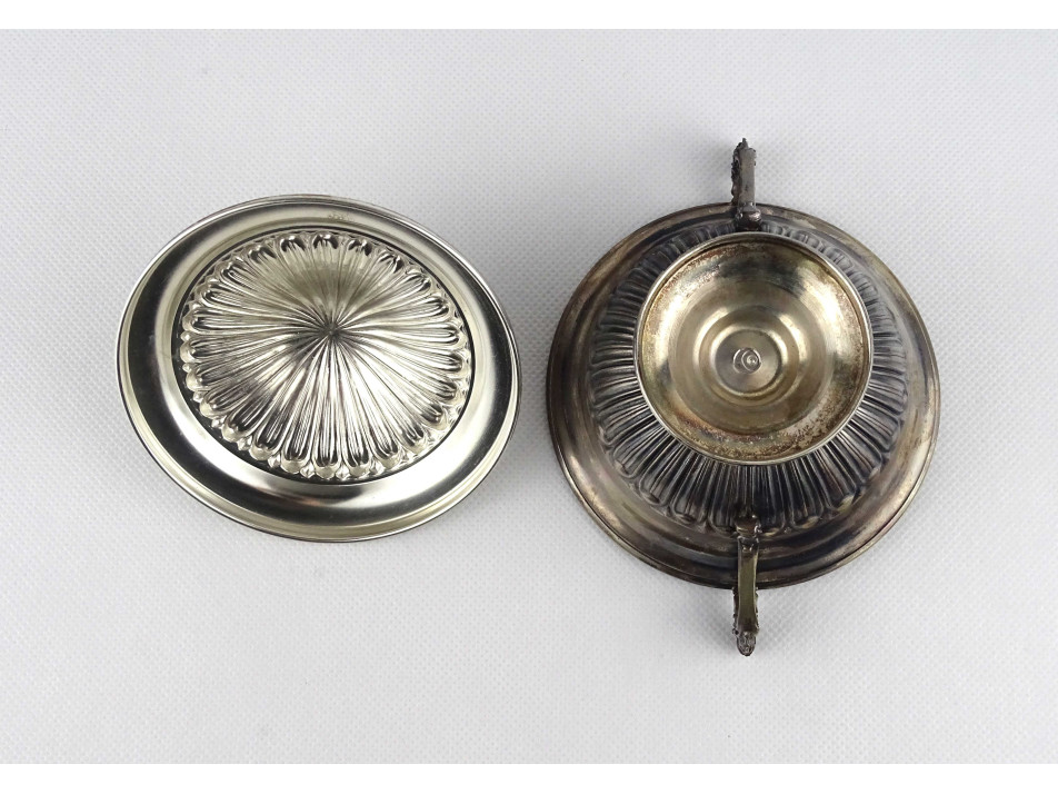 Régi, jelzett, 800-as finomságú, antik formavilágú és díszítésű, kerek alakú olasz ezüst kis tál, tálka, fedeles bonbonier.