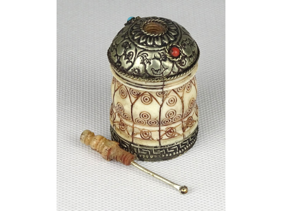 Régi kisméretű keleti csont tároló tégely ópiumtartó tégely kanállal