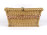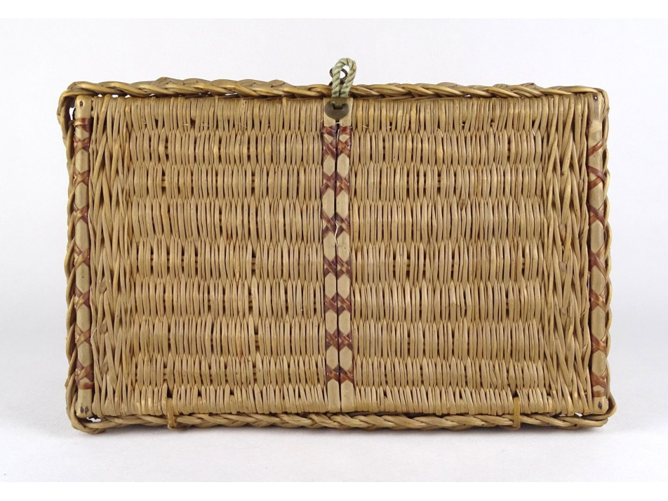 Régi, kis méretű fonott kosár. Míves, díszes fonási technikával készült, részletgazdag darab. Pici réz zár füllel rendelkezik. Belseje csipke szélű, varrott selyemmel bélelt. 1920-30-as évekbeli darab.