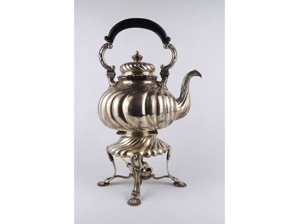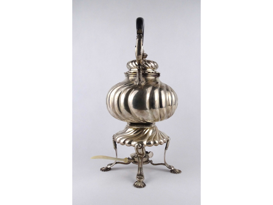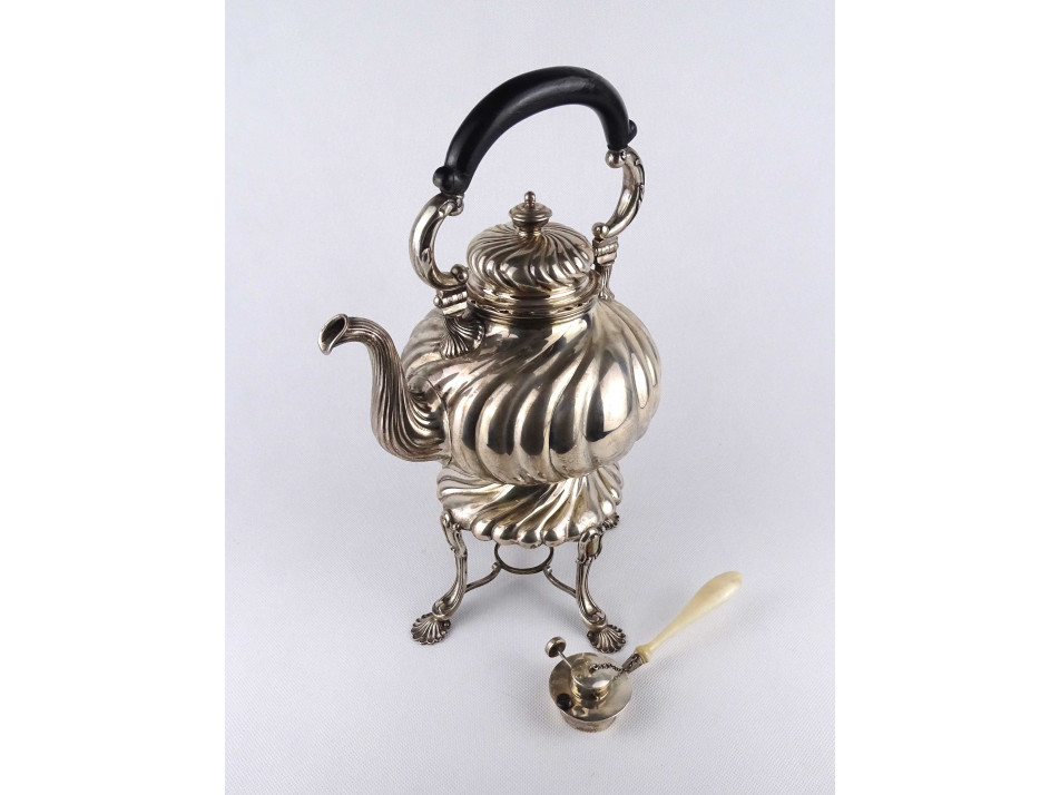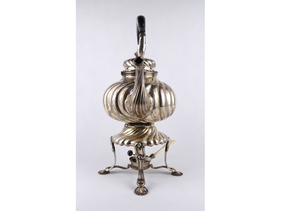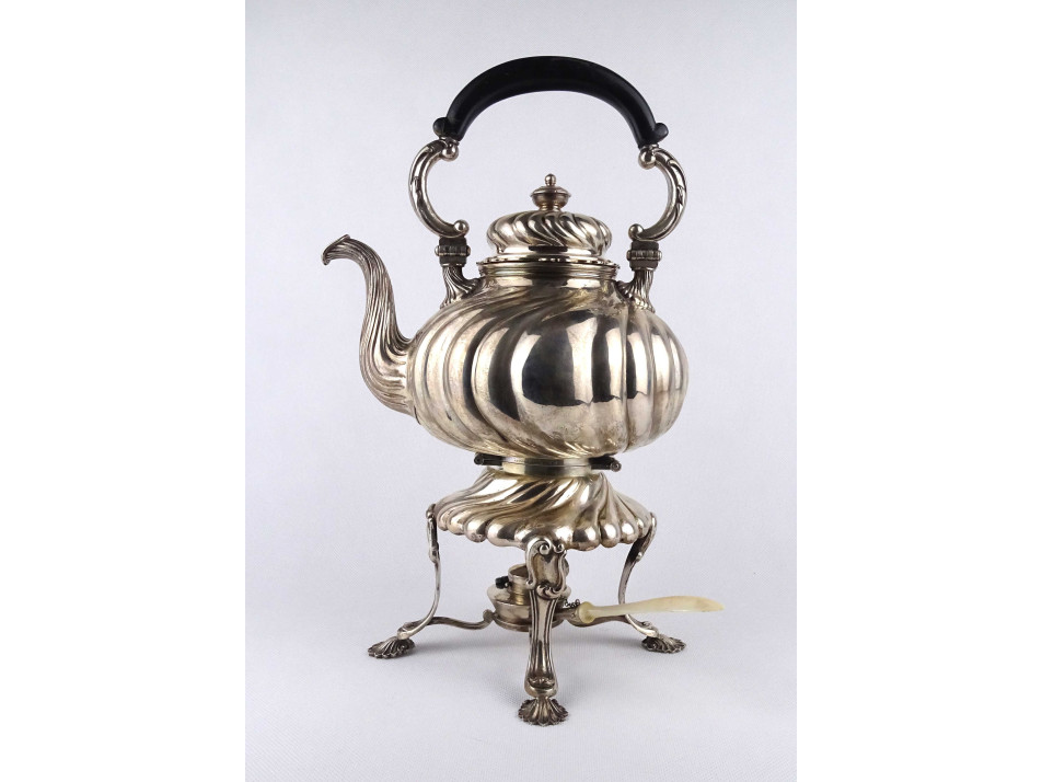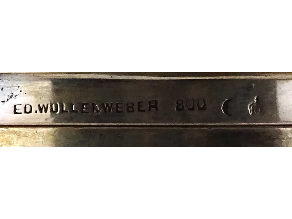 Antik, nagyméretű 800-as finomságú, német ezüst teáskanna, állványos szamovár. A kannát két kivehető stift tartja egyben a melegítő állvánnyal, amiből a spirituszos melegítő külön kivehető. A teáskanna fa fülű, a spirituszos égőnek csont nyele van. A kanna alján és alsó peremén antik német koronás holdas 800-as ezüstjelzés valamint az "ED WÜLLENWEBER" mesterjel látható.