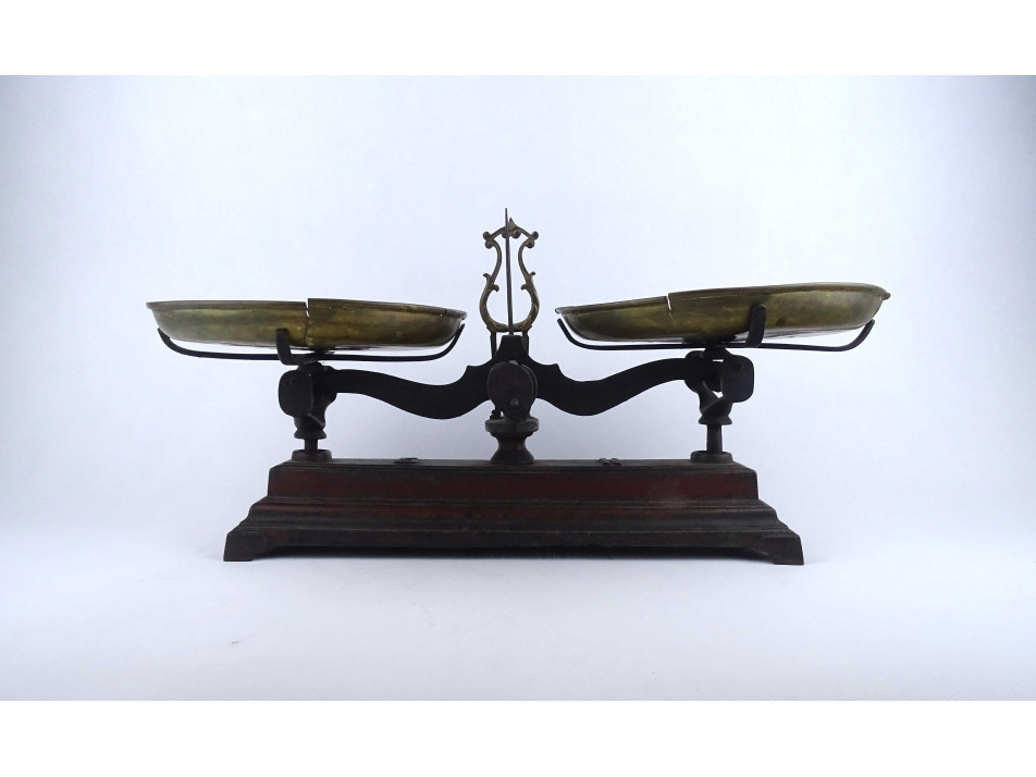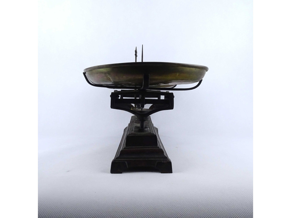 Antik, szép állapotban lévő, működő konyhai, vagy piaci kéttálcás mérleg. A mérleg öntöttvasból, a tálcái rézből készültek. Néhány festékkopás látható rajta, a réztálcák szélei repedezettek.