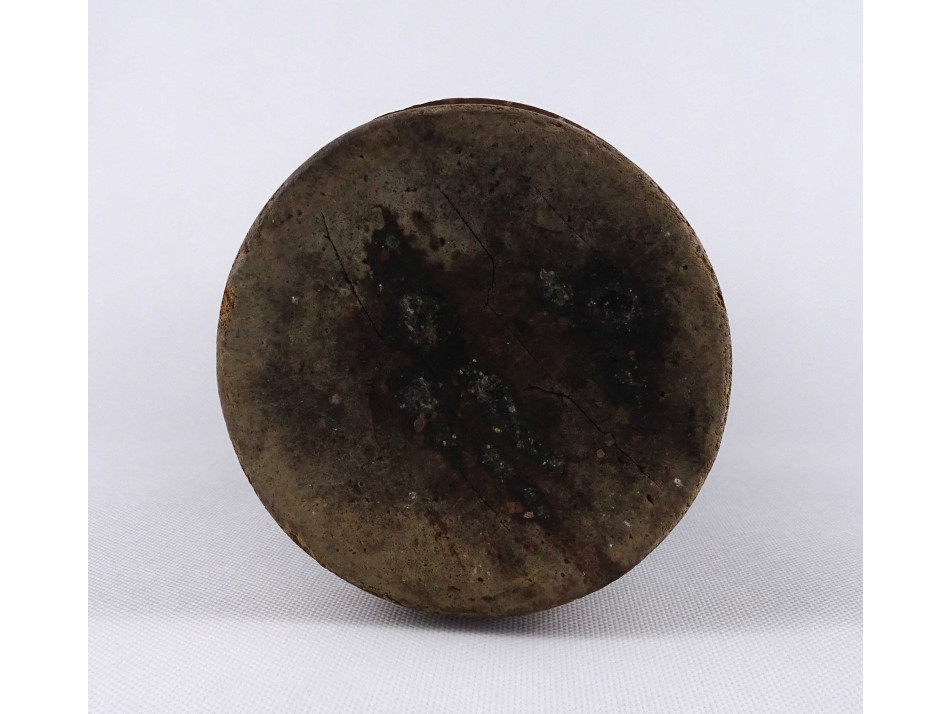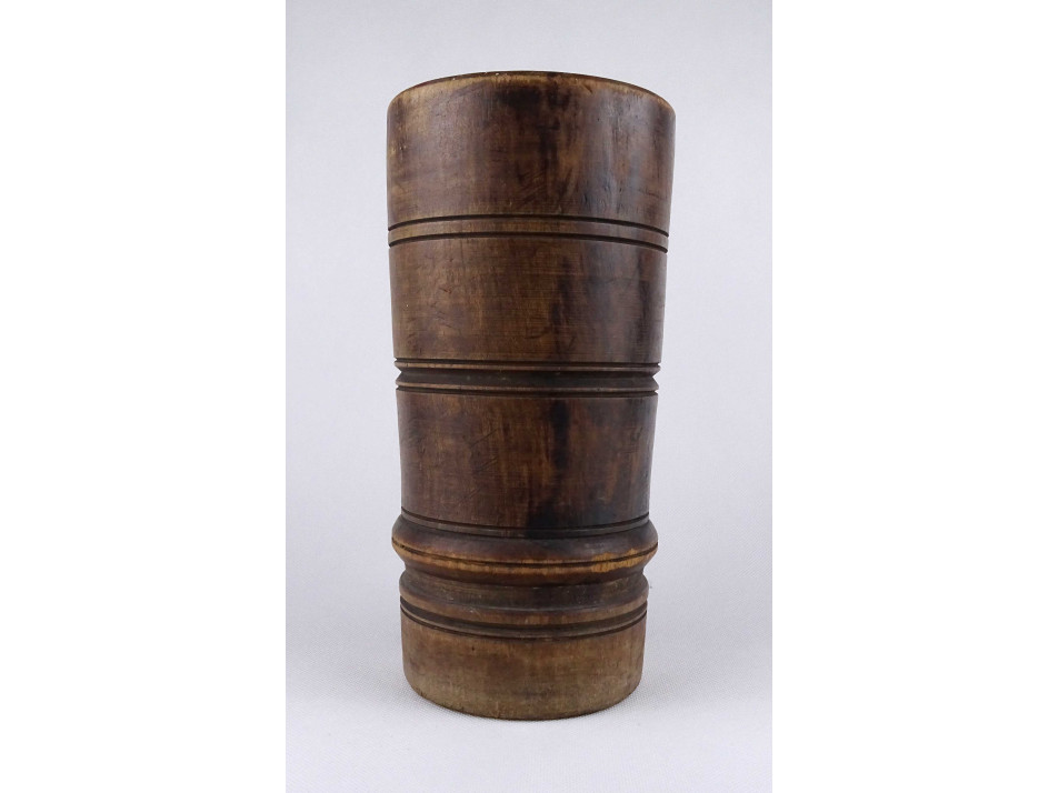 Antik, egy fából faragott vastagfalú, esztergált, sávos mintával díszített mozsár, törő nélkül.