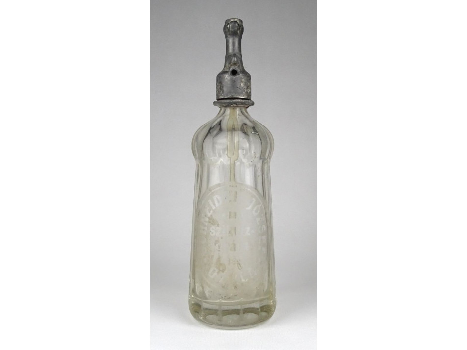 Antik szép állapotú nagy méretű áttetsző szódásüveg szikvizes üveg palack, jelzett sasfejes ónfejjel.