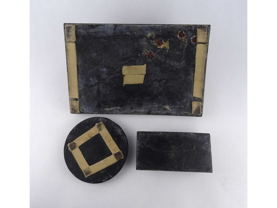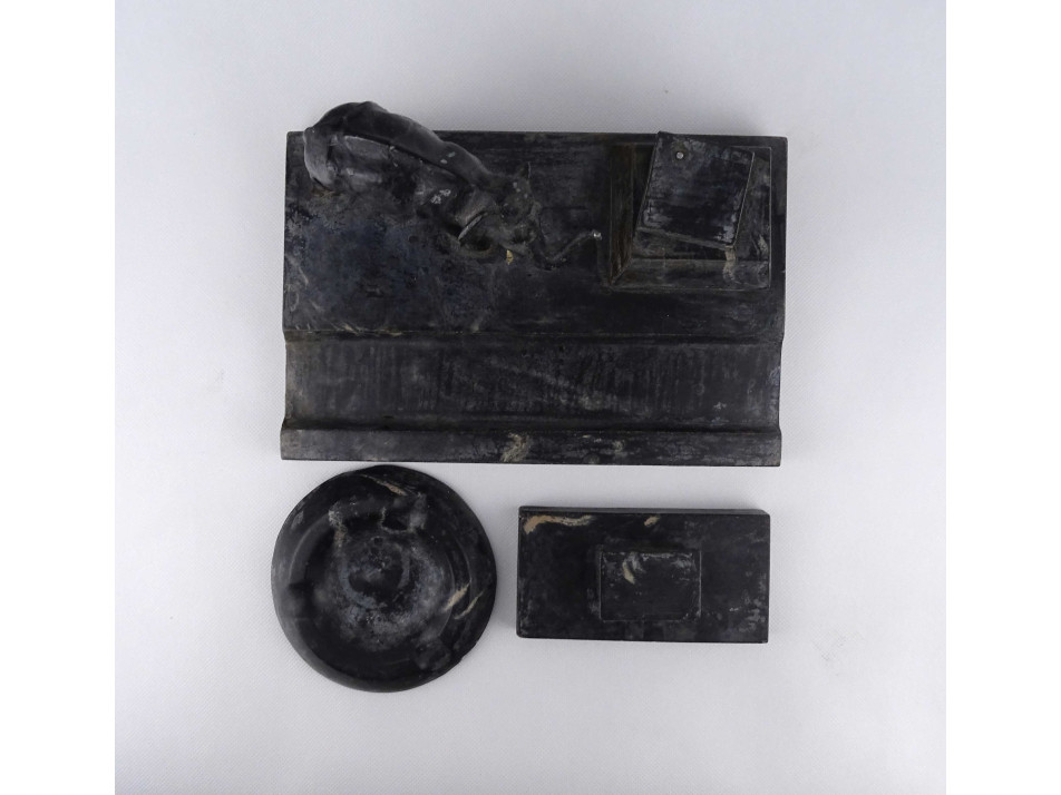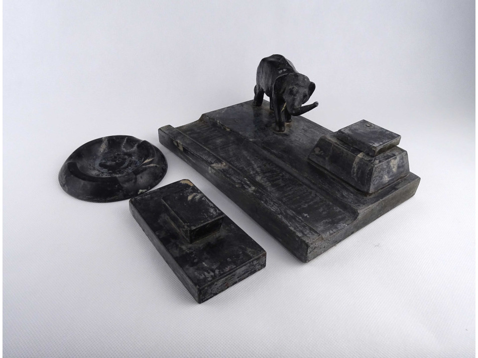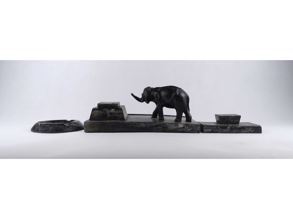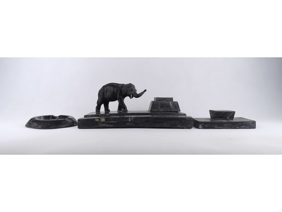 Régi, szép állapotú, sötét színű, márvány mintás, ón elefántszoborral díszített íróasztali kellék szett. A készlet egy kalamárisból, egy tapperből és egy háromállásos hamutálból áll.