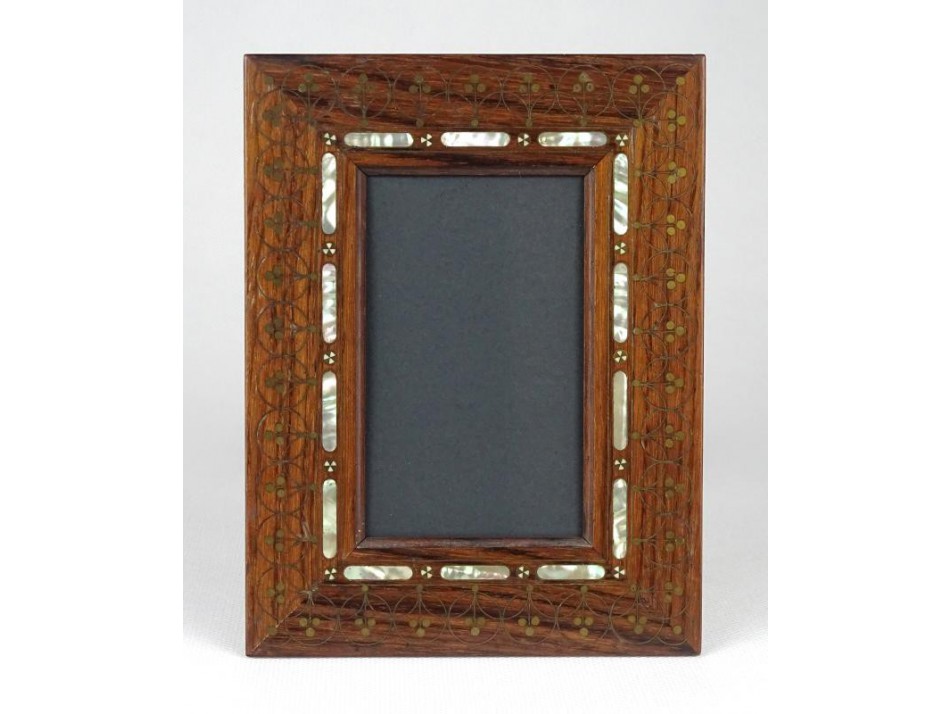 Antik, szép állapotú fényképtartó. Oldalán körben gyönyörű réz és csiszolt gyöngyház, kagylóhéj berakás látható.