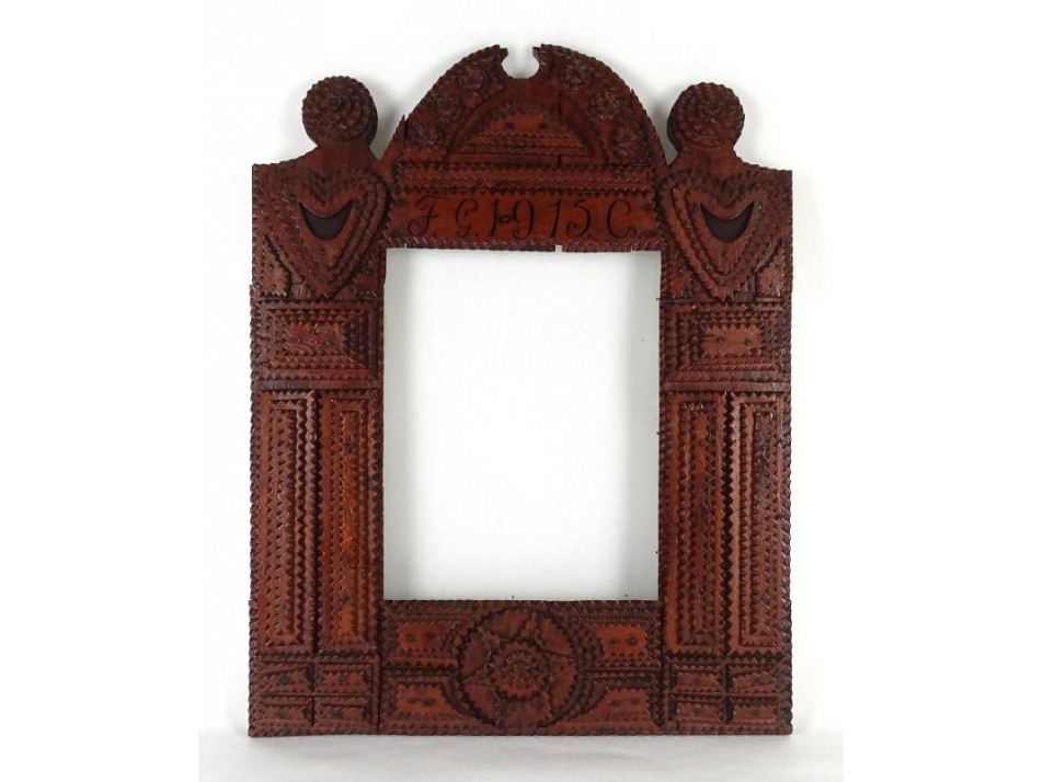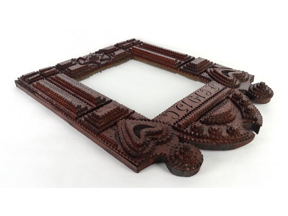 Régi, nagy méretű, szép állapotú, gazdagon faragott fényképkeret, üveglappal. Akasztási lehetőséggel rendelkezik. Rajta két oldalt szív díszítés látható. Középen vésett monogram és dátum látható: F.G. 1915 CS.