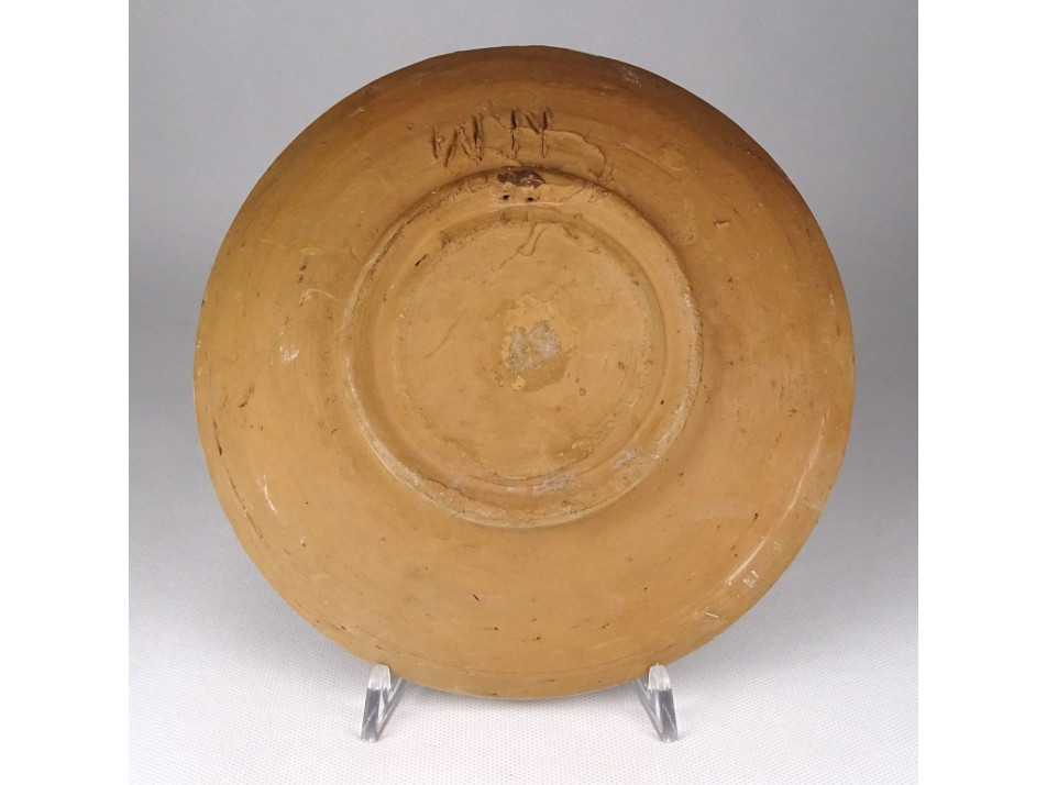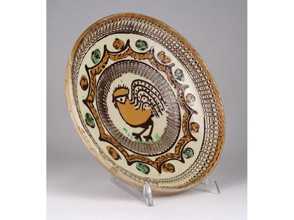 Szép állapotú, antik 19. század végi cseréptál, falra akasztási lehetőséggel rendelkezik. A tányér felületén kisebb mázkopások találhatók. Közepén madár, kakas díszítéssel. Hátoldalán az akasztó mellett karcolt jelzés, lásd fotó.