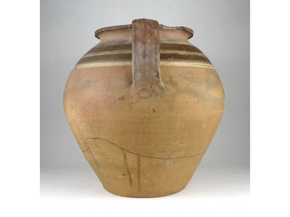 Régi nagy méretű, kétfülű, széles szájú, nagy hasas gömöri cserép. Nyakánál mázas. Alja törött, ragasztott és a száján egy kitörés található, lásd fotó.