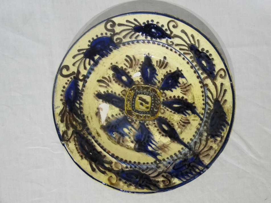 Régi fali dísztál, folyatott kék-barna mázas cserép. A tál közepén felirat ZALAU 500 1973 évszámmal. A teljes felirat a dupla zászlóval plasztikusa kiemelkedik a tányér aljából.