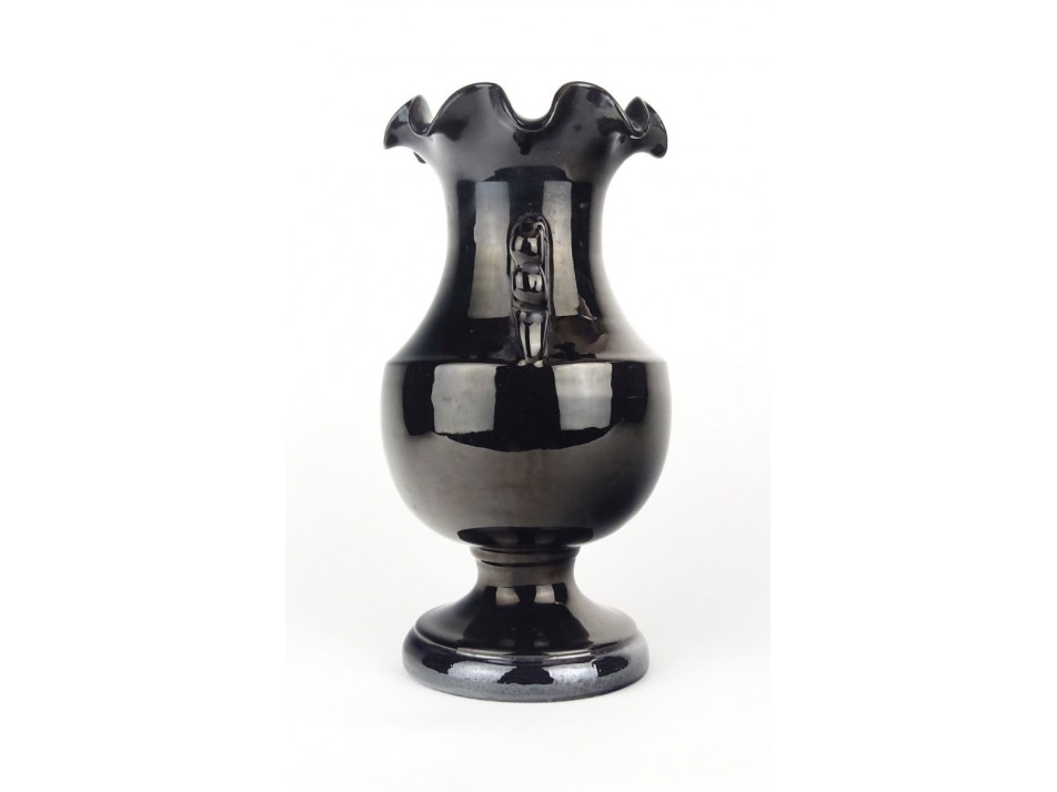 Régi, szép állapotú, jelzett, fekete színű, fodros peremű, mázas kerámia két füles talpas váza. peremét profi restaurátor javította.