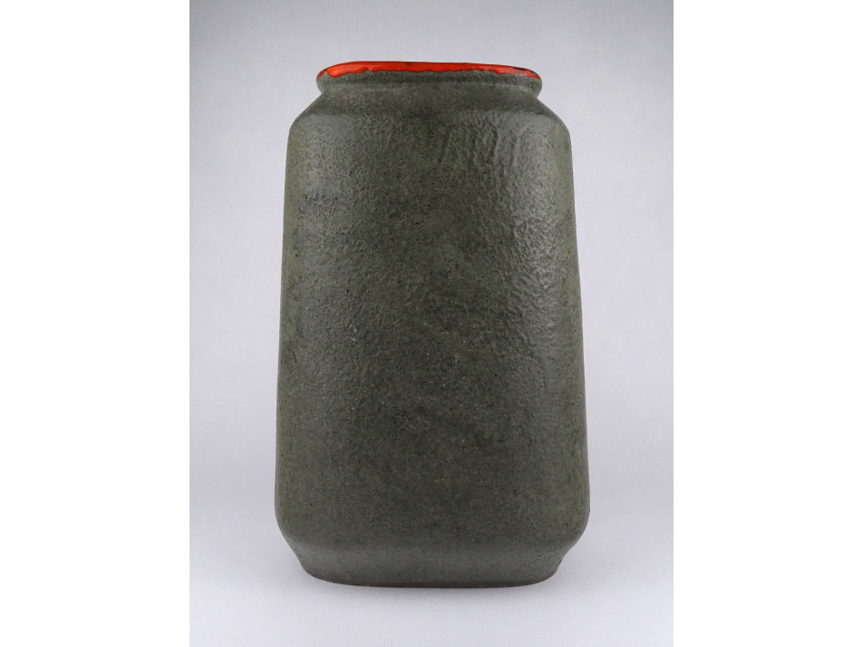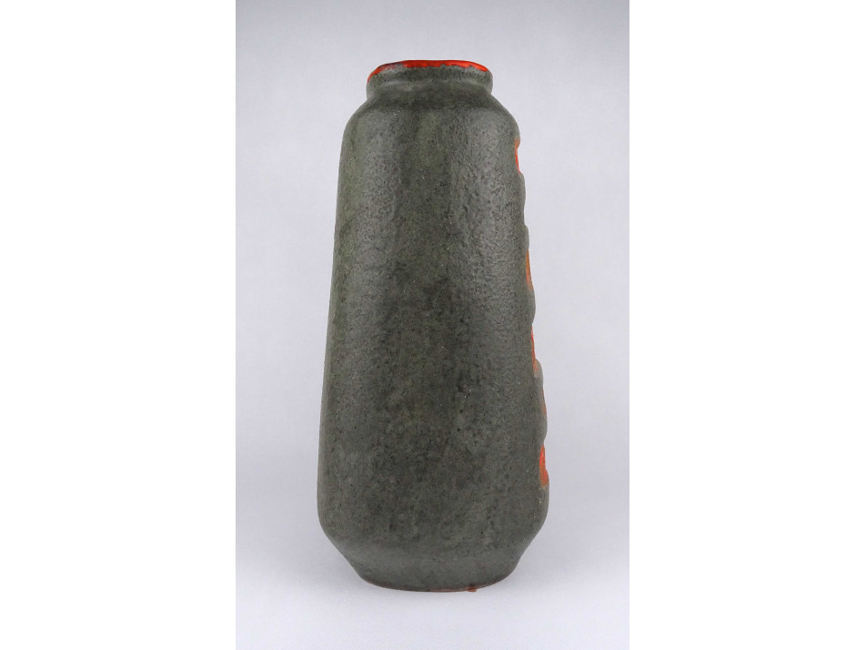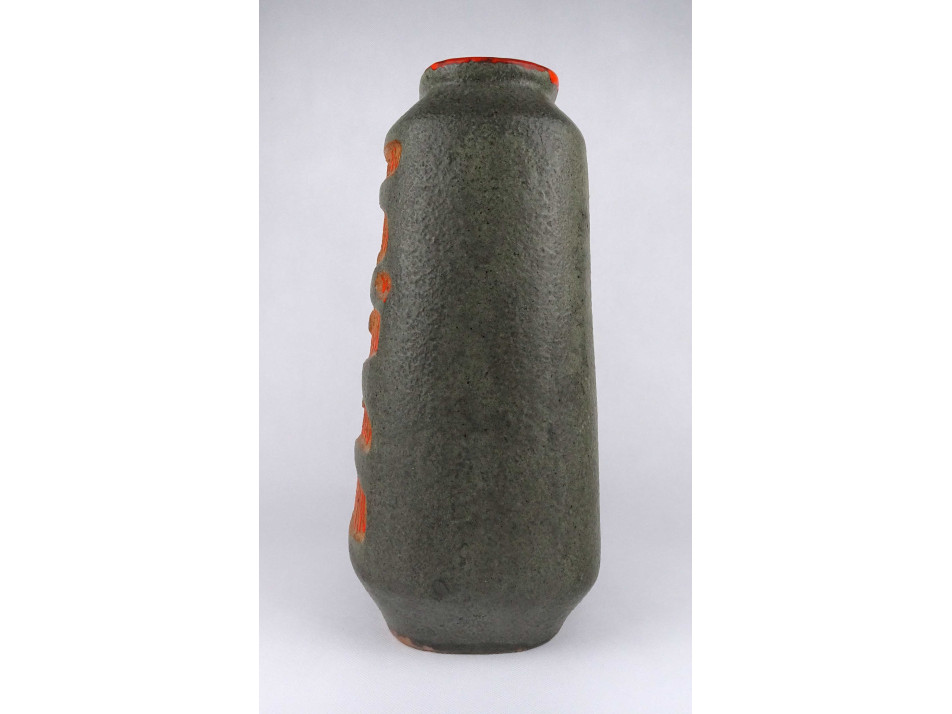 Hibátlan állapotú, nagyméretű, iparművészeti, zöld mázas, kerámia váza, padlóváza élénk narancssárga nonfiguratív díszítésekkel.