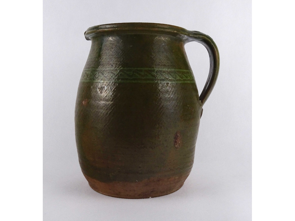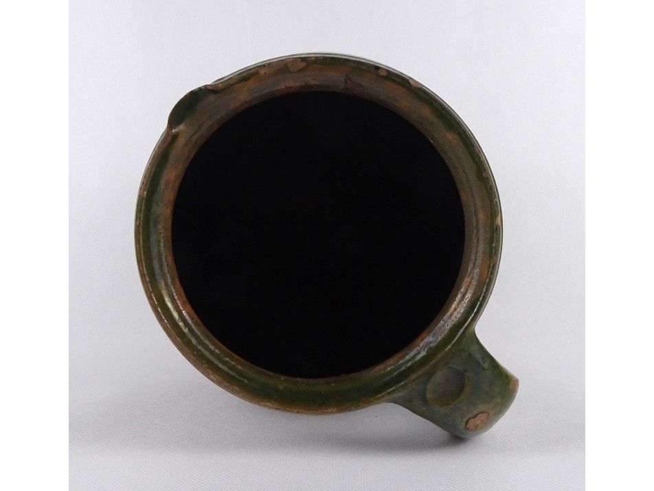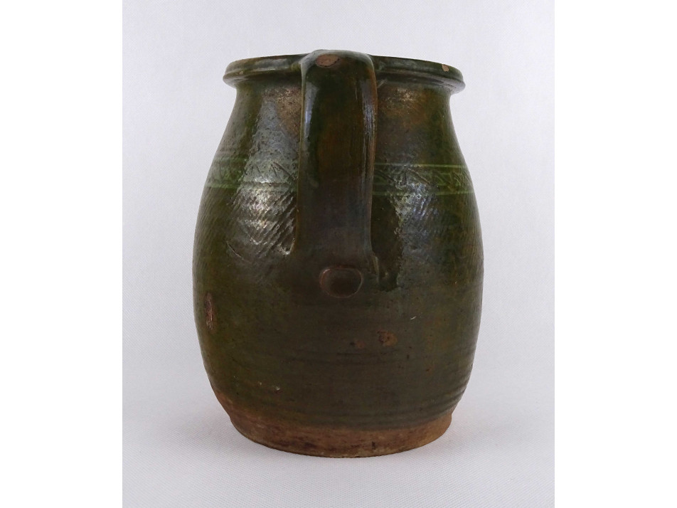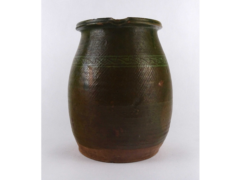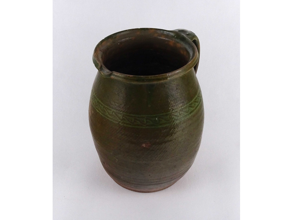 Antik, nagyméretű, zöld mázas mezőségi cserép korsó, szilke.
