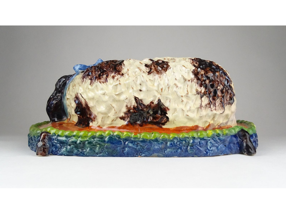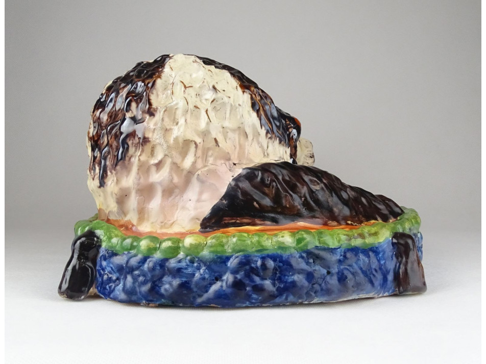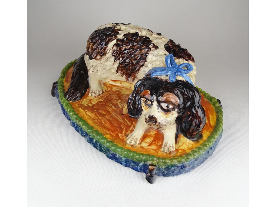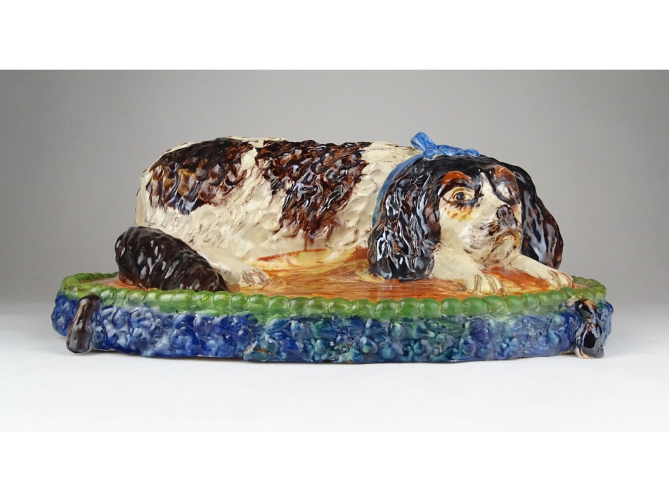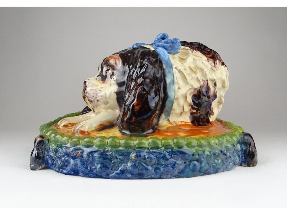 Antik, szép állapotú, díszpárnán ülő spániel kutyus, gyűjtői nagyméretű mázas kerámia.