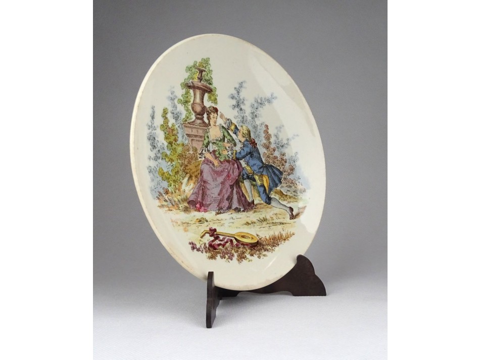 Antik, hibátlan állapotú, jelzett, francia fajansz tányér, dísztányér. Rajta kétalakos romantikus rokokó jelenet.