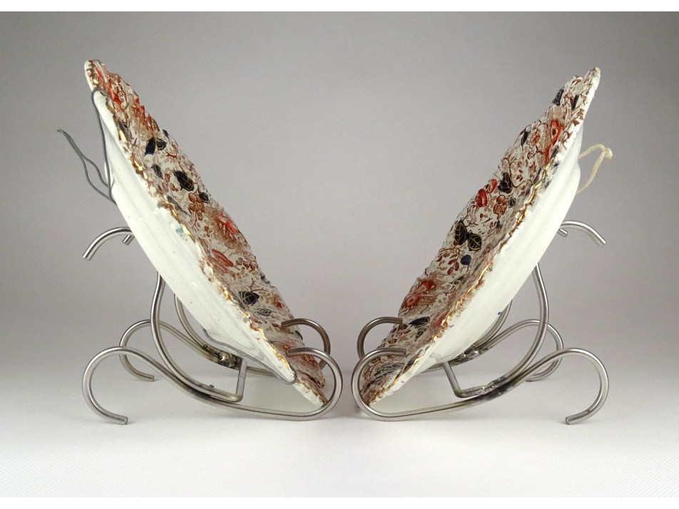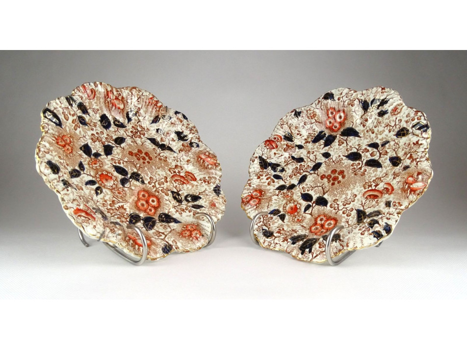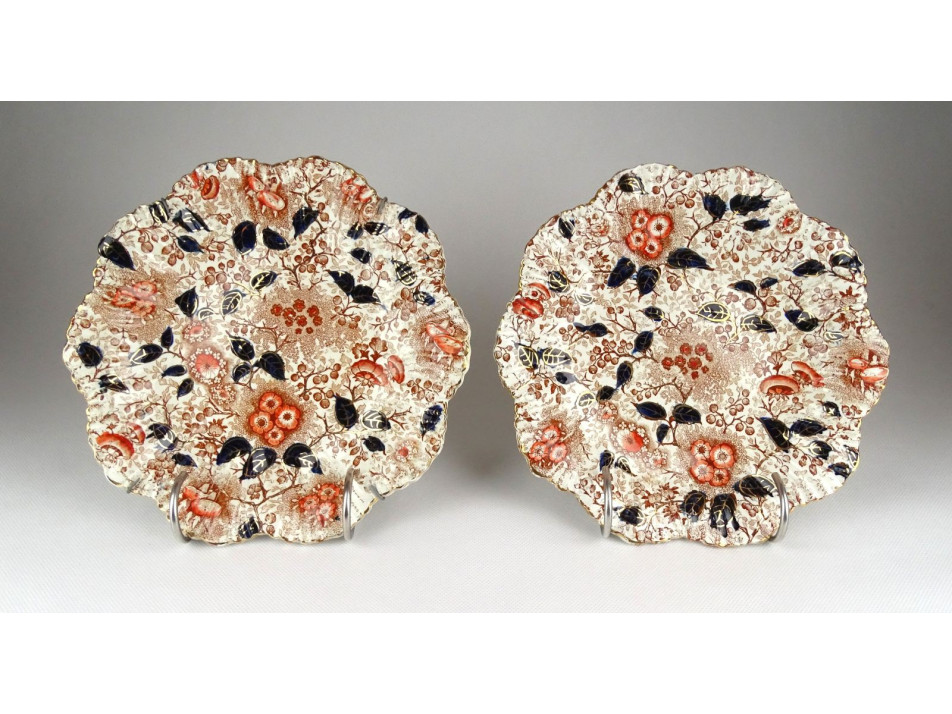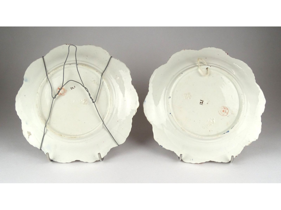 Antik, falra akasztási lehetőséggel rendelkező fajansz dísztányér, falitányér pár. Felülete gazdagon díszített, kobaltkékkel és arannyal festve. Mindkét darabon kisebb hajszálrepedés található, lásd fotó.