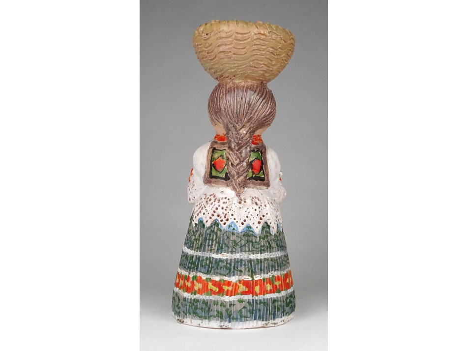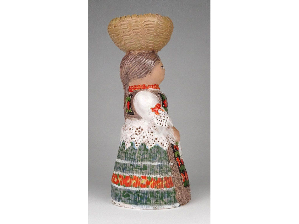 Hibátlan állapotú, kézi festéssel díszített, jelzett kerámia figura. Népviseletes kerámia menyecske szobor, gyertyatartó.