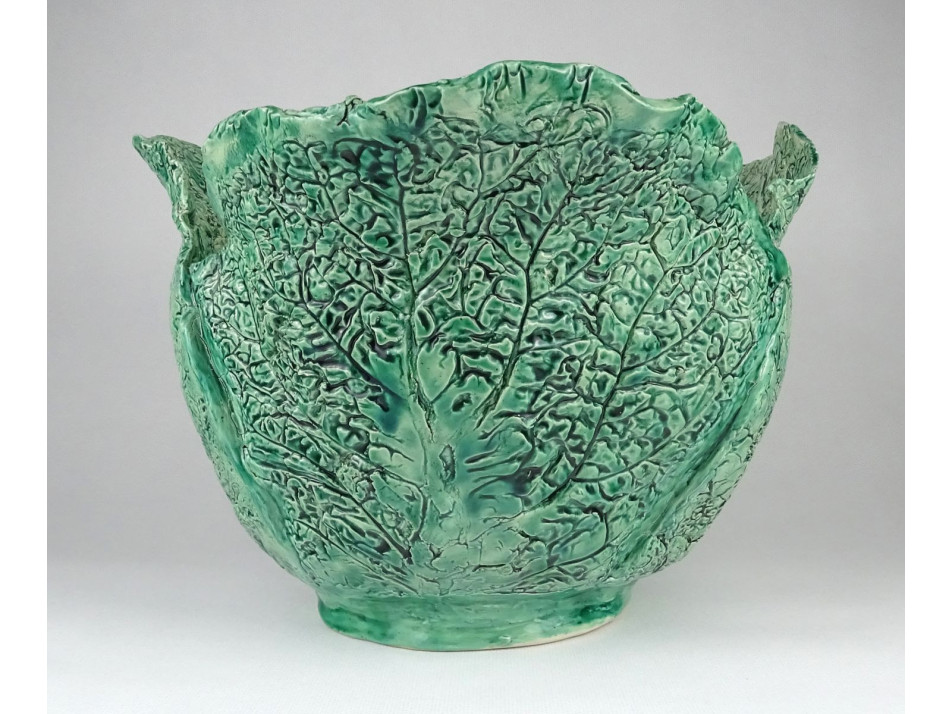Nagy méretű, szép állapotú, zöld mázas kerámia kaspó. Mintázata káposzta levelet vagy salátalevelet mintáz.