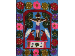 Hibátlan állapotú, nagy méretű, máz nélküli, jelzett kerámia figura. Menyecske, fedetlen fővel, népviseletben, kezében kendő, keszkenő.