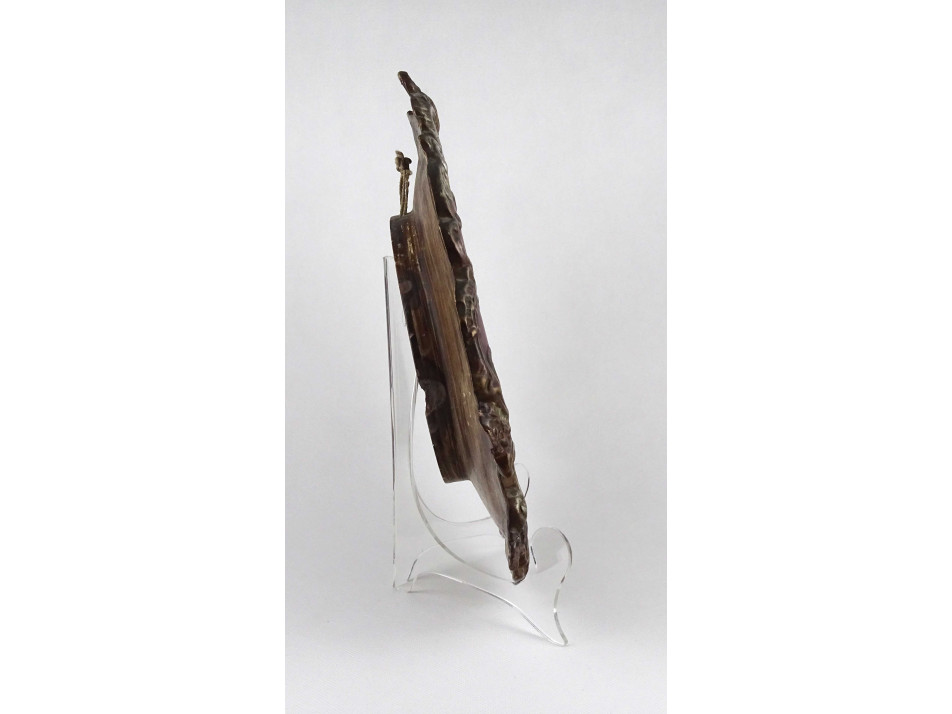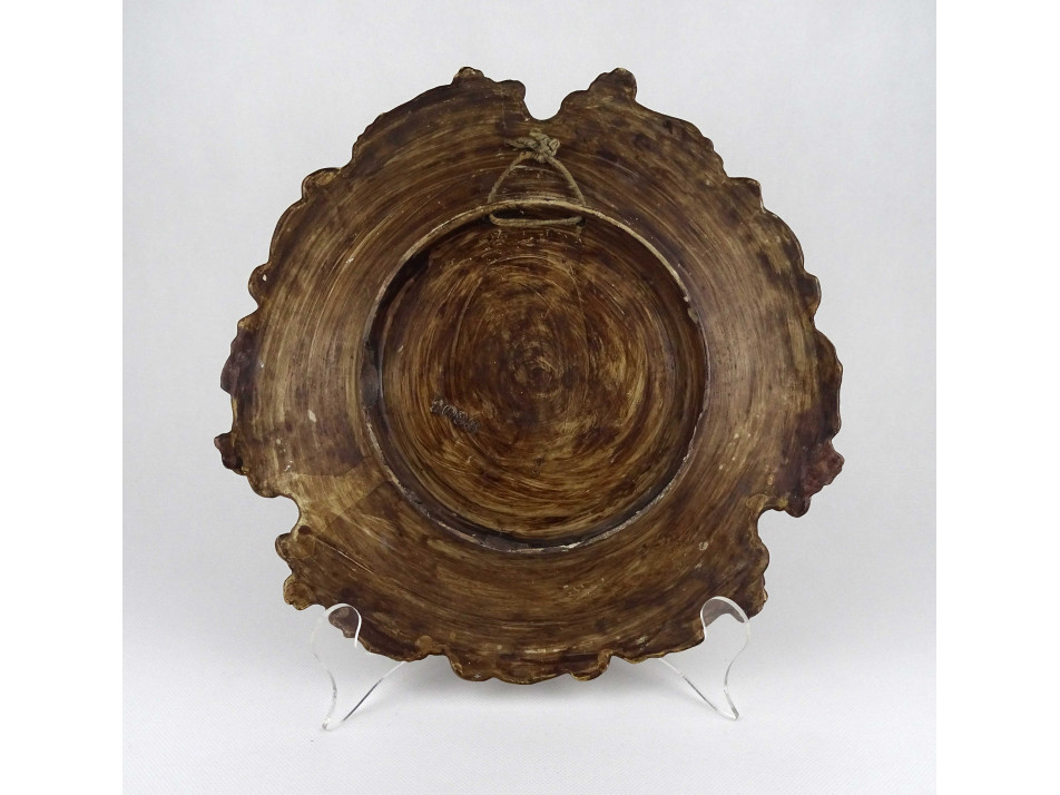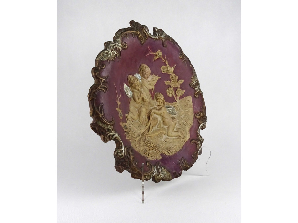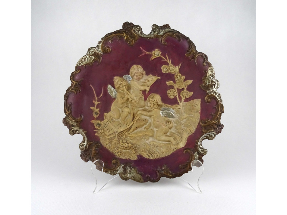 Antik, szép állapotú, három zenélő puttóval, angyalkával díszített terrakotta falitál, fali dísztál, falra akasztási lehetőséggel. A tányéron egy hajszálrepedés található, de ez csak hátulról észrevehető.
