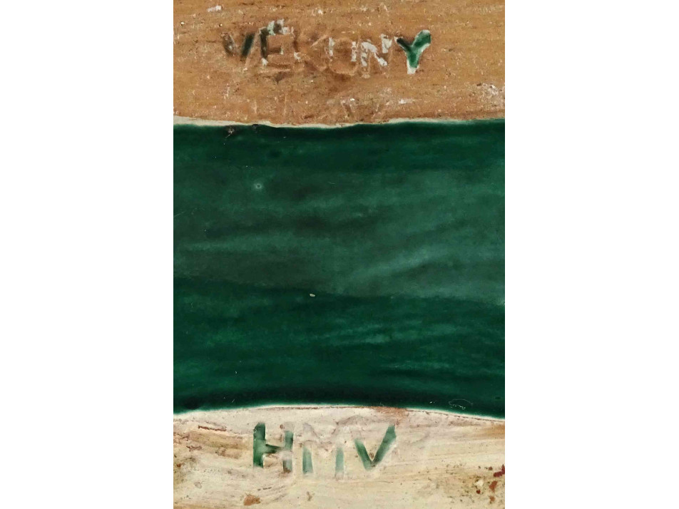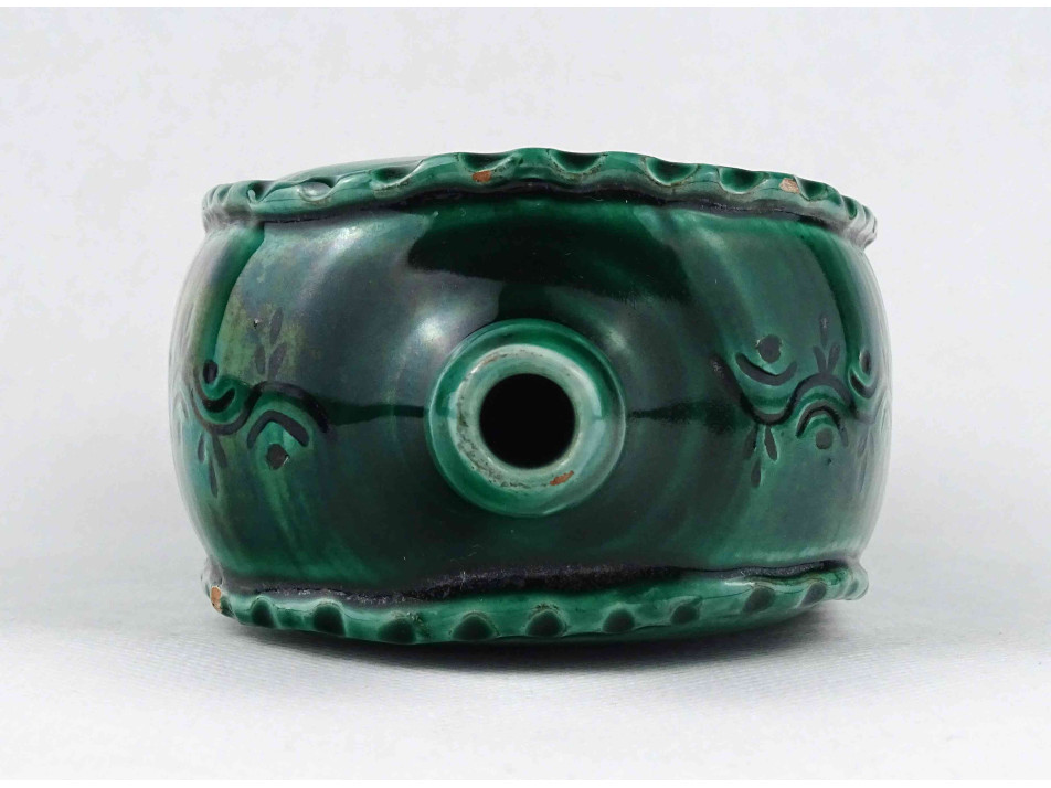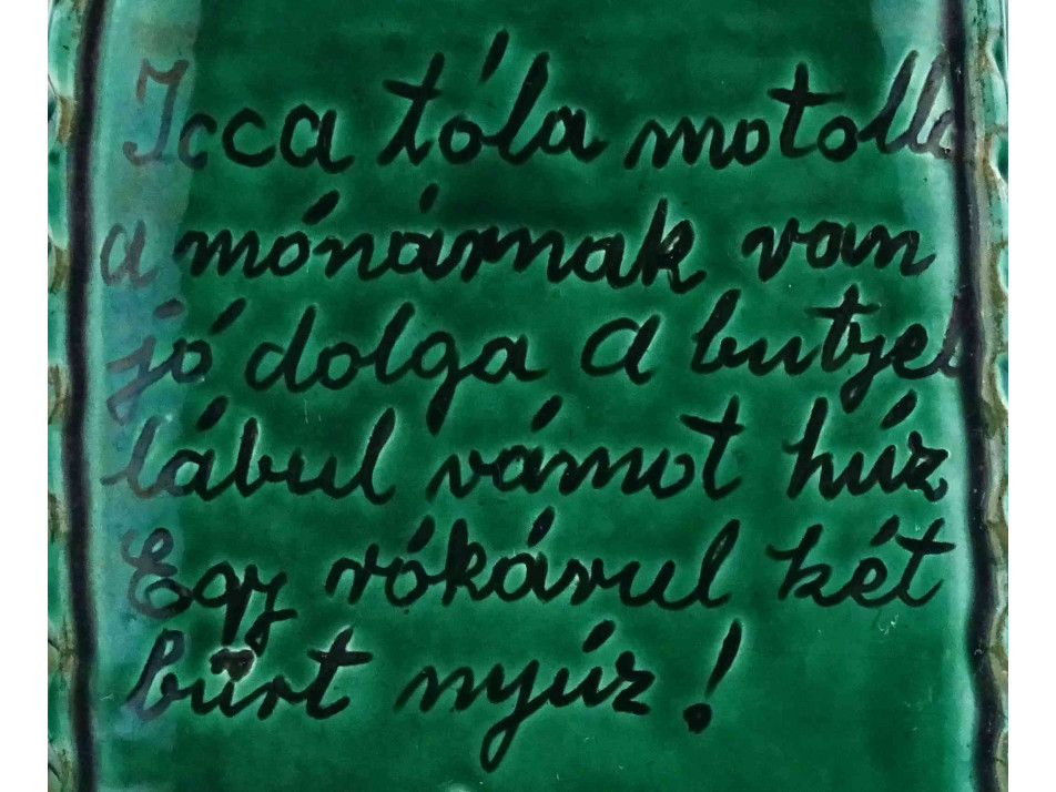 Régi, szép állapotú, jelzett, zöld mázas feliratos kerámia butella. A butellán néhány apró lepattanás található.
