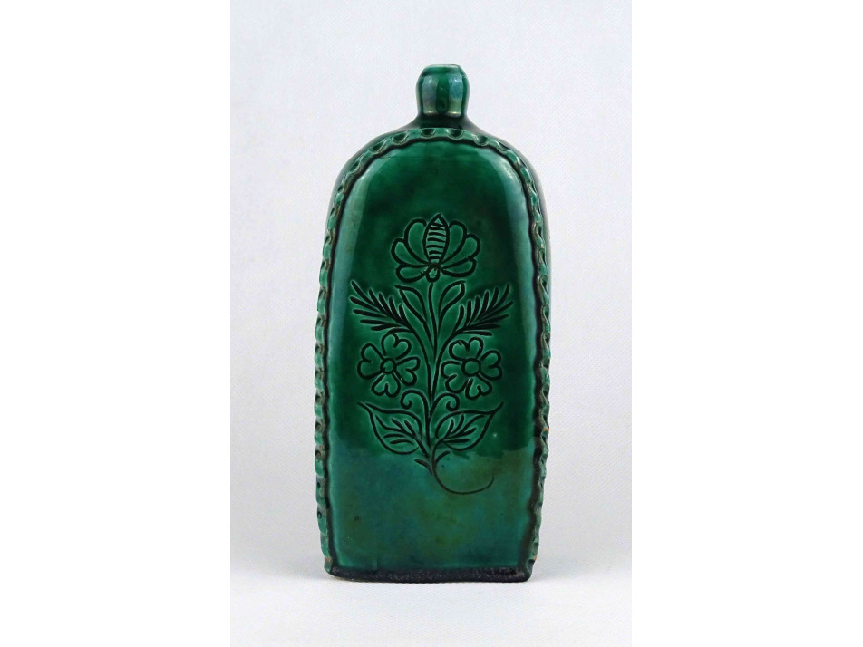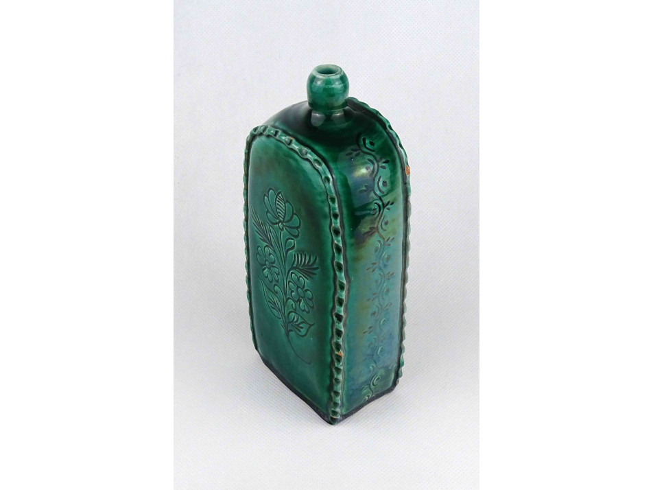 Gyönyörű zöld mázas feliratos vásárhelyi VÉKONY pálinkás butella