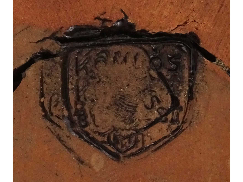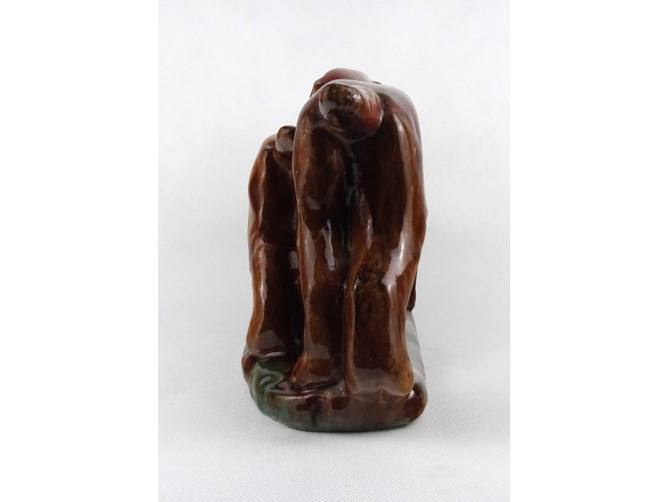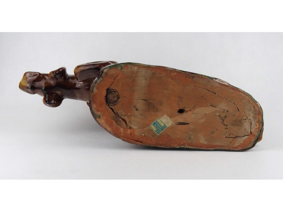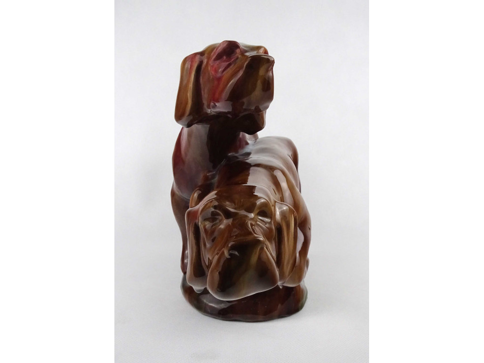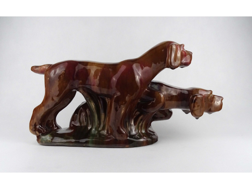 Hibátlan állapotú, nagyméretű barna - zöld mázas Komlós kerámia vadászkutya pár, talapzaton.