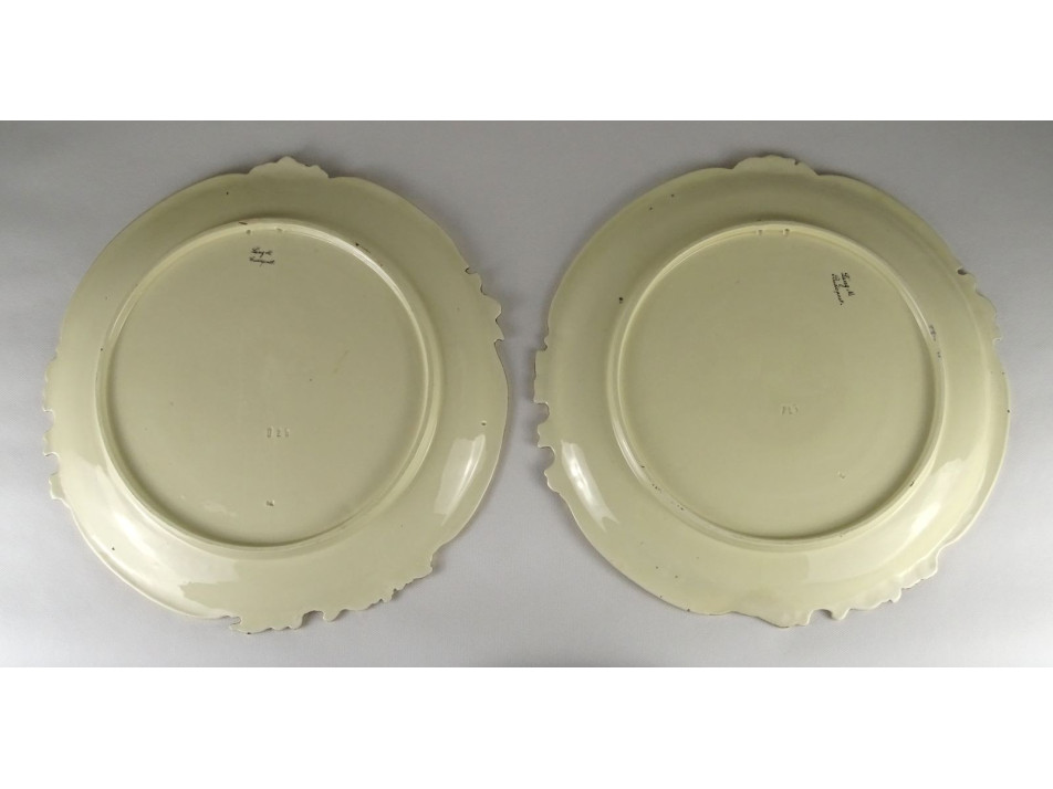 Antik, jelzett, falra akasztási lehetőséggel rendelkező, hibátlan állapotú, kézzel festett, gazdagon díszített vajszínű majolika dísztál párban. Gyönyörű Zsolnay szintű darabok! Az egyik darab szélét profi restaurátor javította.