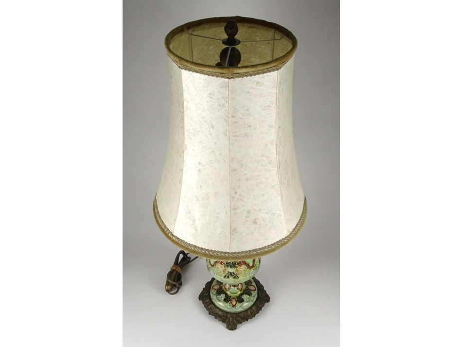 Hibátlan állapotú nagy méretű majolika lámpa. Szépen kimunkált réz talpon áll. Rajta szép állapotú bura. Működőképes, újravezetékelt, azonnal használható állapotban van. Kettő darab nagy méretű (E27) izzó való bele.