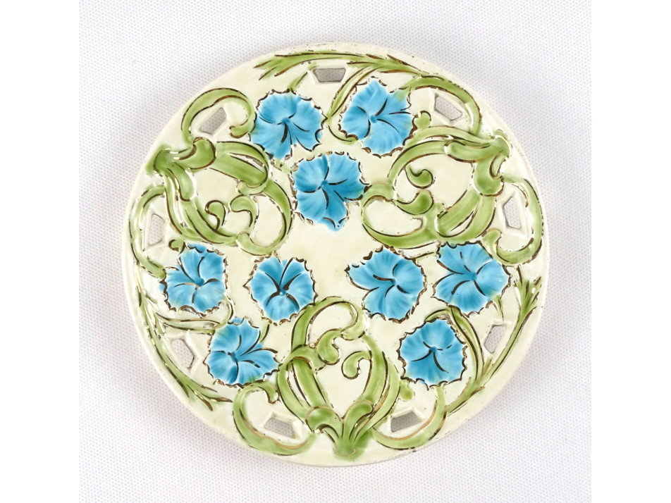 Gyönyörű, antik, kék virágmintás szecessziós majolika süteményes készlet. A